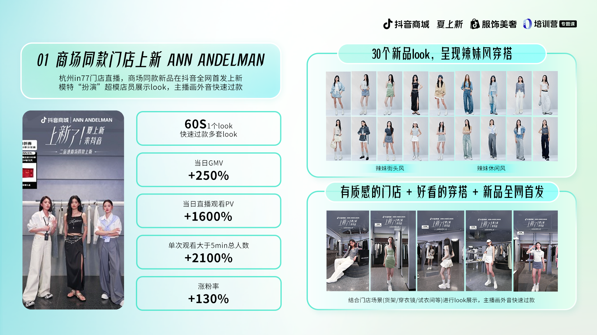 ANN ANDELMAN 将直播间搬进品牌线下门店,突出商场同款上新的卖点,模特化身超模店员展示上新穿搭look。结合门店场景(货架/穿衣镜/试衣间等)设计模特动线,主播画外音快速过款。有质感的门店+好看的穿搭+新品全网首发,助力当日内容、成交双爆发,当日直播观看PV提升近16倍,店播GMV增长超2倍,单次观看时长超过5分钟的人数增长超过2100%。