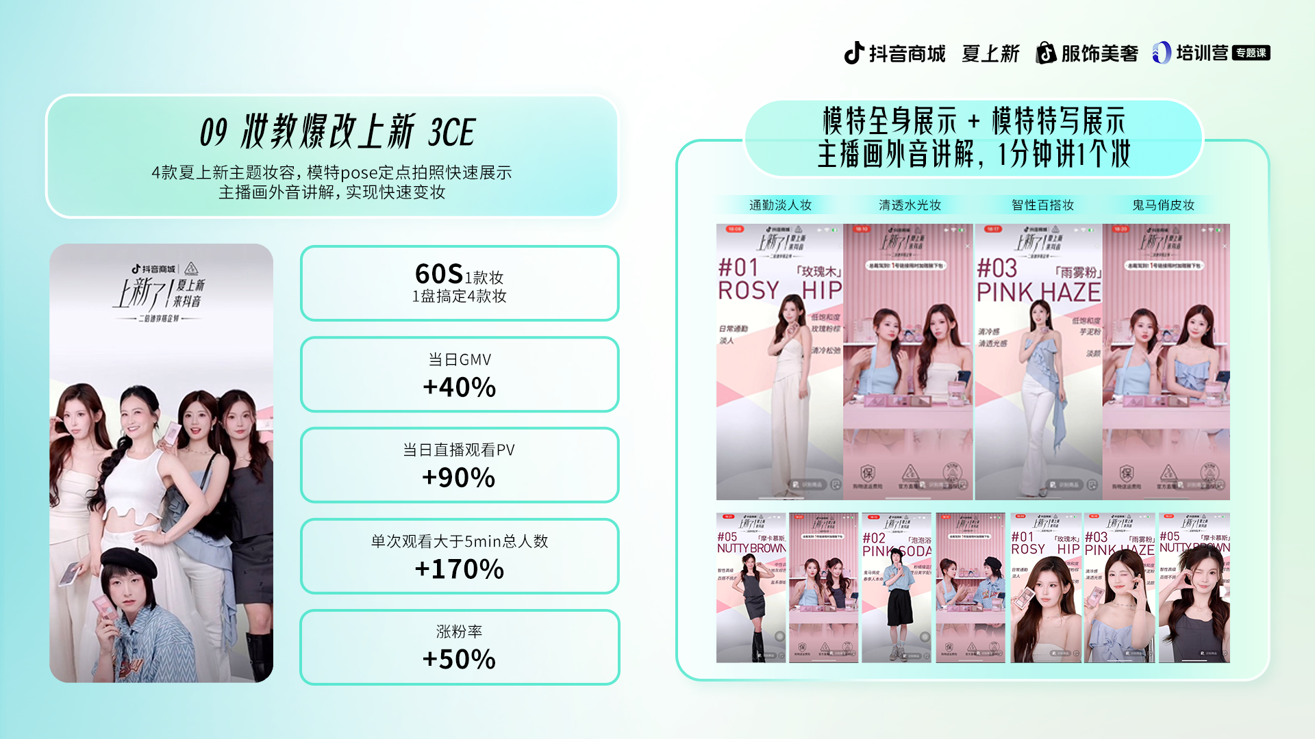 3CE“叠叠乐”系列新品上新,4个模特轮流上台,定格pose展示不同风格妆面,主播画外音介绍妆容和产品,快速演绎四款夏上新主题妆容,实现1分钟换1个妆,直播观看PV和GMV数据显著增长,单次观看时长超过5分钟的人数增长超过170%。