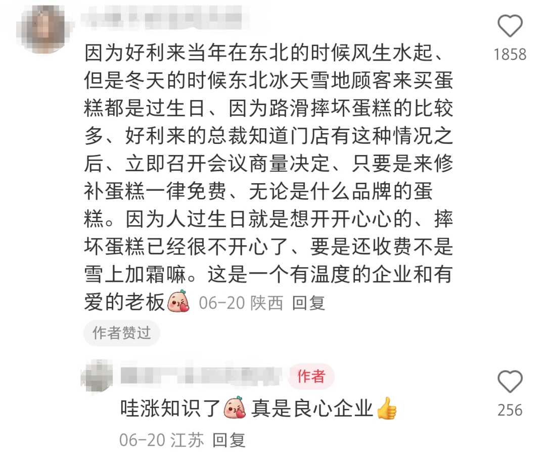 也有网友在社交平台上分享过,说好利来创始人罗红之所以想要开蛋糕店,也是因为跑遍了整个小镇,也没有给退休母亲买个像样的蛋糕。也是在这些暖心故事的影响下,很多人也感知到了好利来想要传递的品牌态度:蛋糕是情感载体。