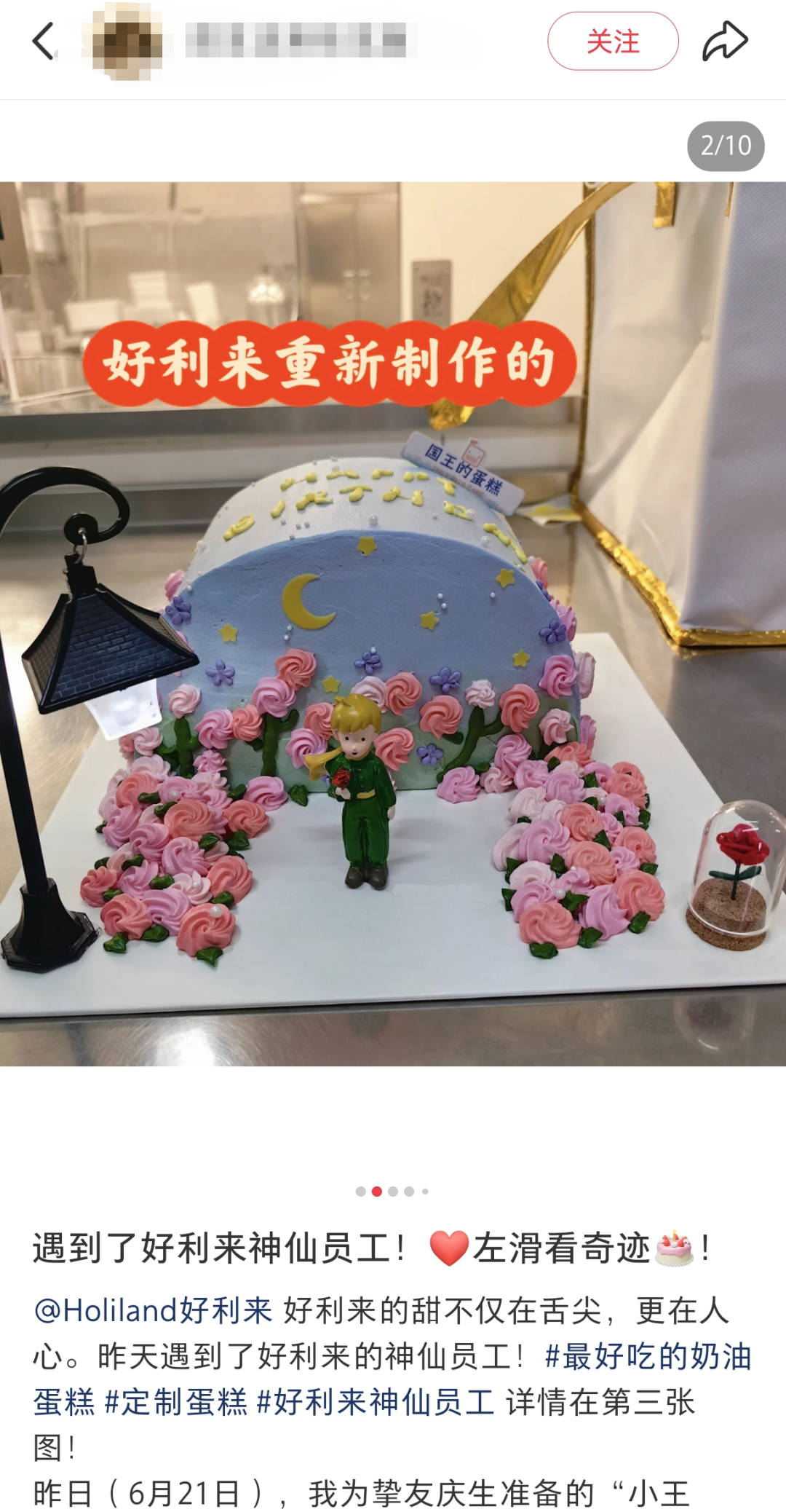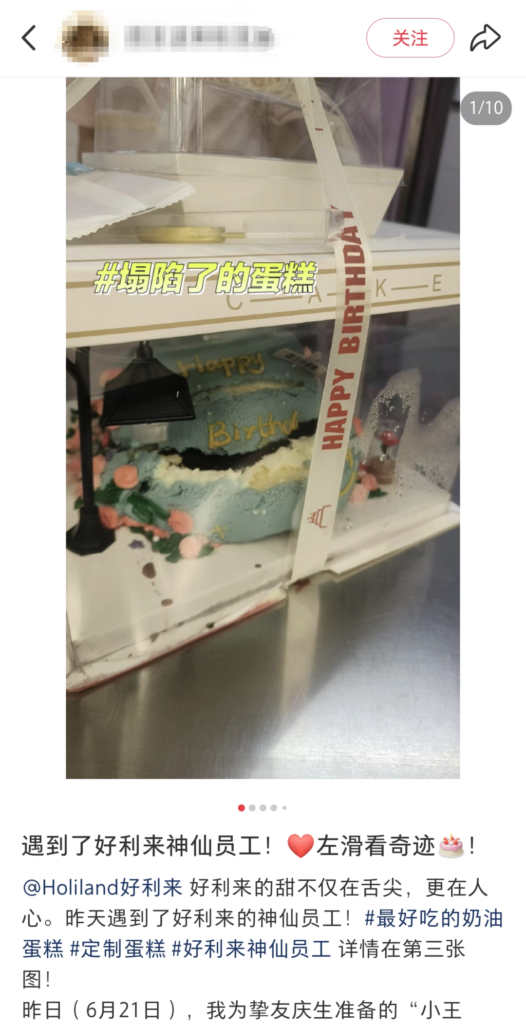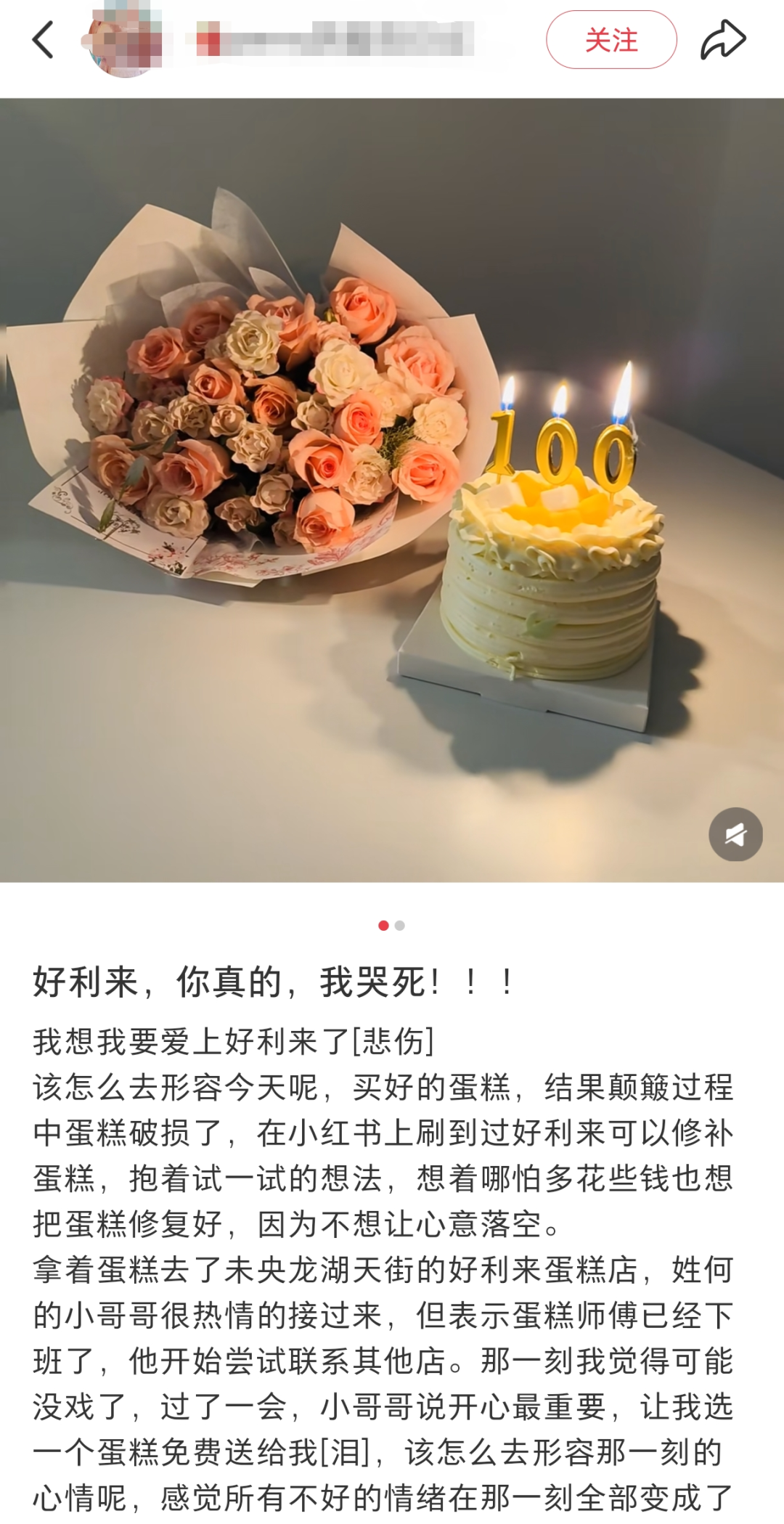 若是从这个角度想,很容易发现好利来做这件事带来的正向影响——每个人买蛋糕,都是为了纪念重要的时刻,比如结婚、生日、升学等等。在这一天,大家对一个蛋糕的期望值是拉满的,对一个摔坏蛋糕的失望值也是拉满的。然而,如果有一个品牌能够帮自己修复蛋糕,甚至修复后的蛋糕比以前更好,就很容易收获好几倍的情绪价值,这个特殊的日子也会被铭记很多年。