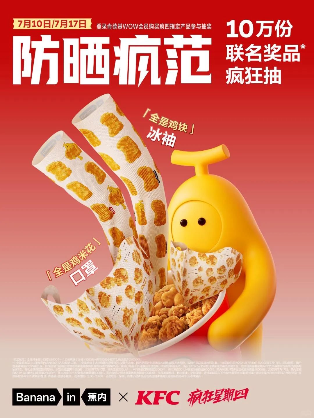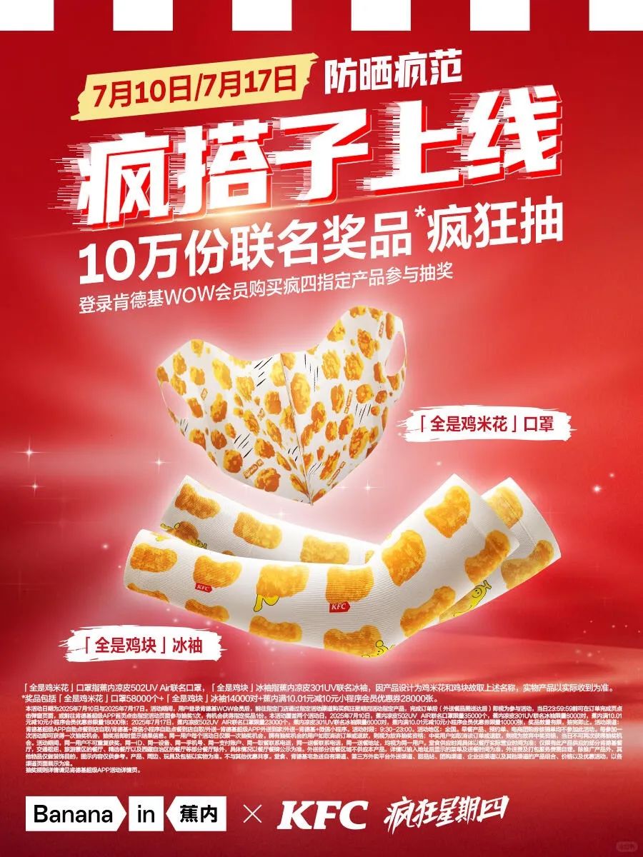 没关系就对了。 7月10日疯狂星期四,肯德基与蕉内组了个「疯搭子」,一起在防晒配件上搞事情。