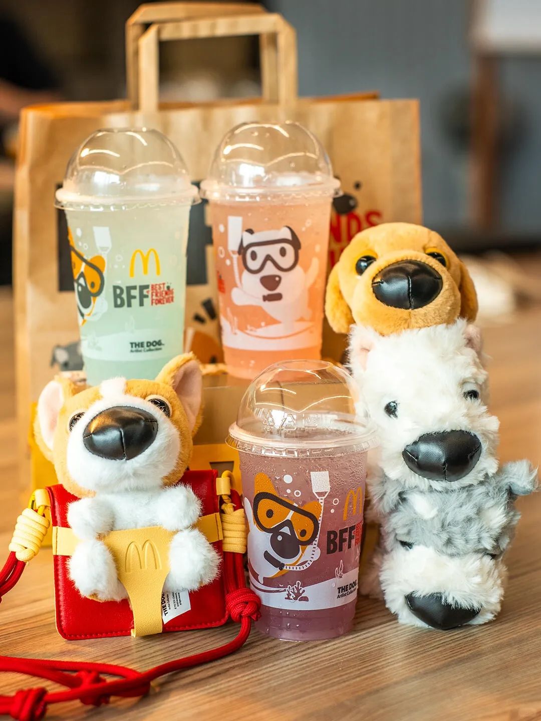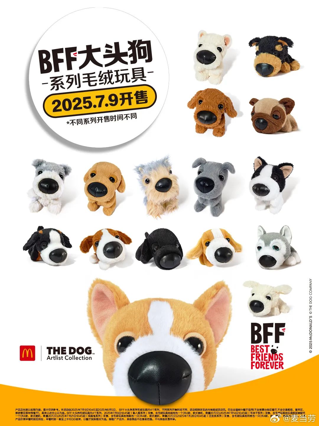 新大头狗分为四个系列:粘人精、毛孩子、捣蛋鬼、汪送员,一个系列内包含四款不同品种的狗狗,总共16款,麦当劳将一周上新一个系列。