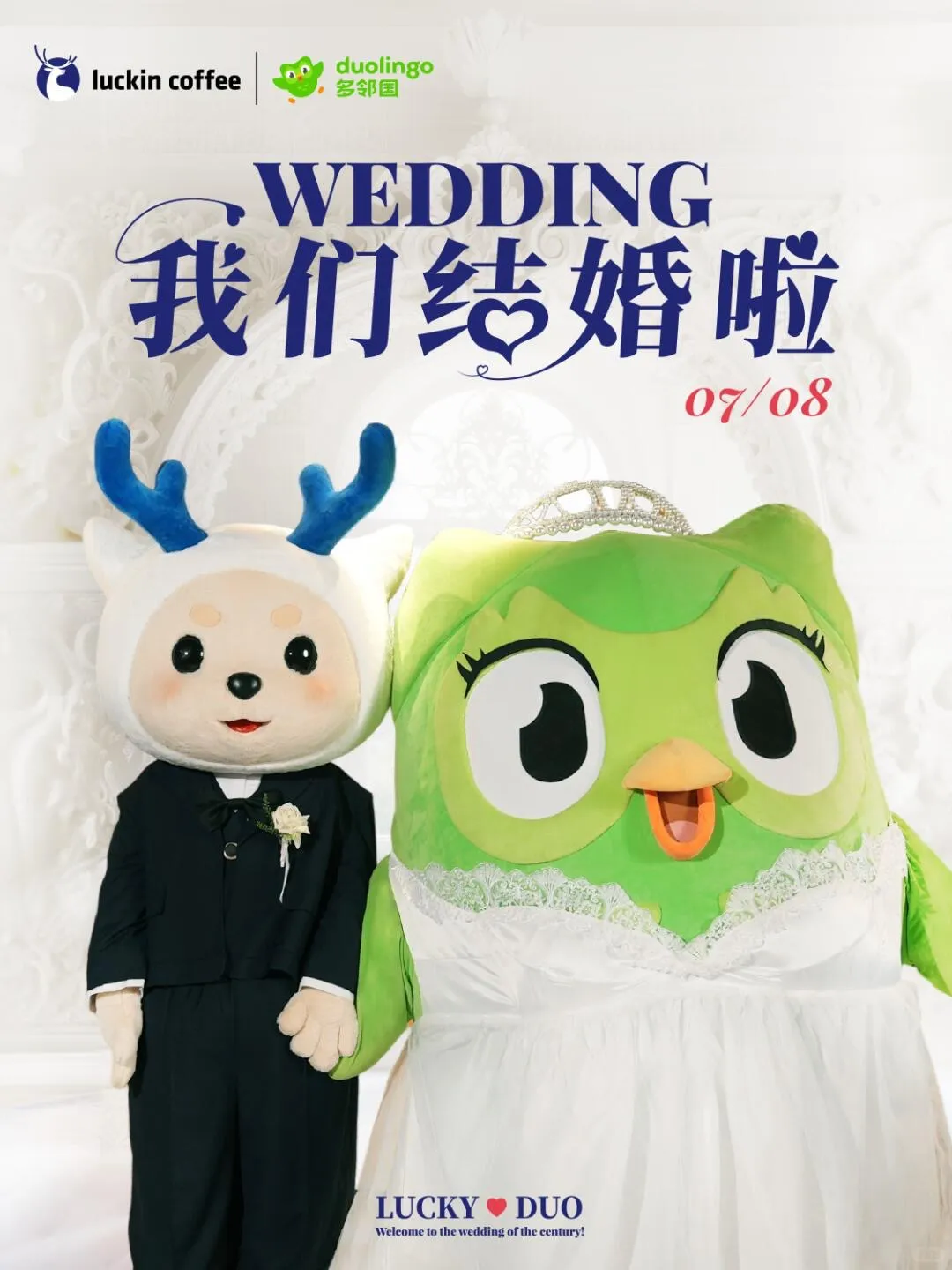 瑞幸咖啡与多邻国app,一个联起名来手拿把掐,一个“装死”催网友打卡背单词。 最近,瑞幸的lucky与多邻国的多儿宣布跨物种“奉子成婚”,举办世纪婚礼,惊呆一众网友。 许多蓝V也来蹭热点抢新娘、随份子(搞抽奖)。