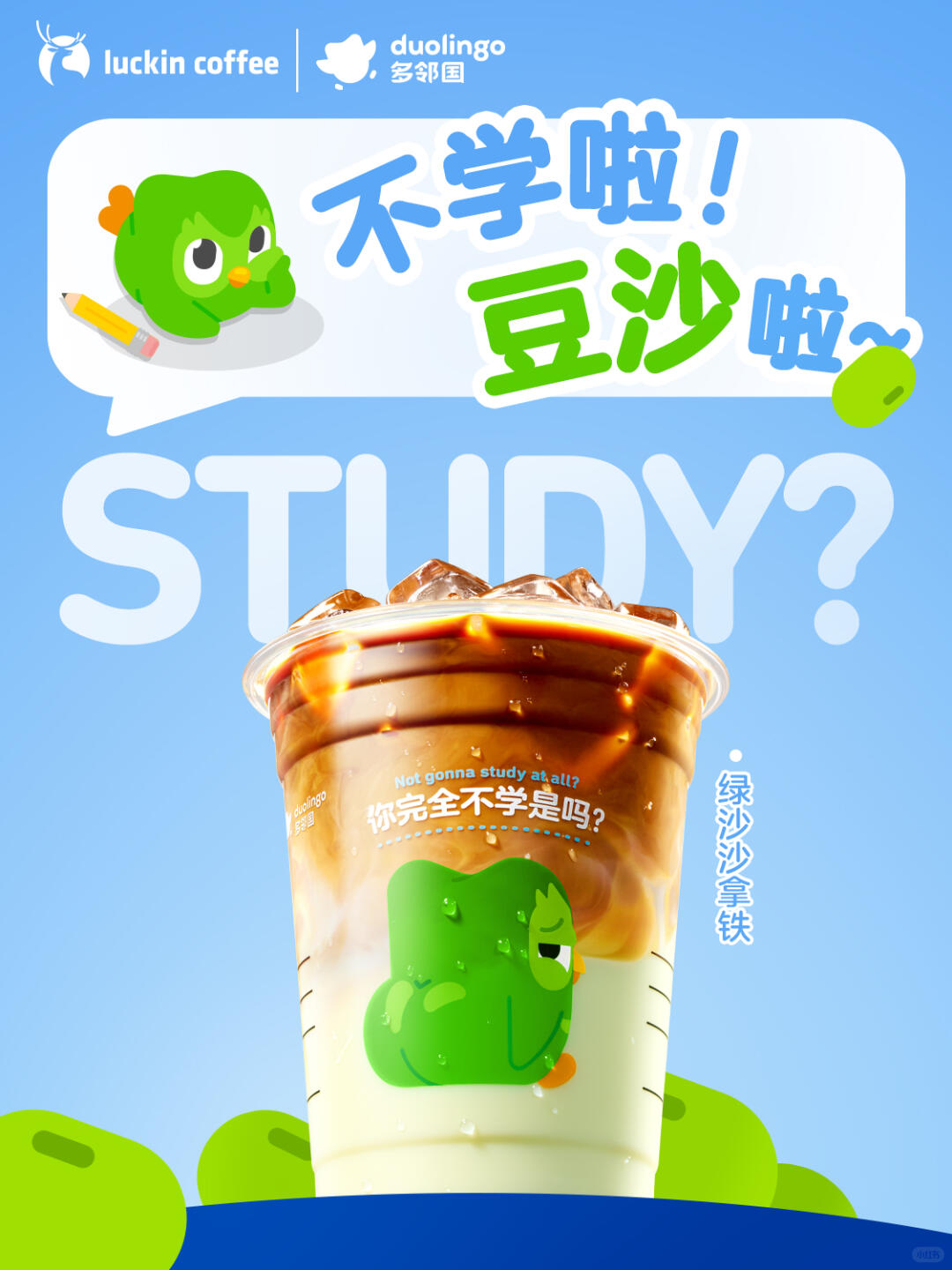 最重要的是,“孩子”绿沙沙拿铁诞生了。“不学啦!豆沙啦~”是提醒网友喝拿铁,也是谐音梗,绿鸟到了瑞幸这里,依然改不掉逼网友学习打卡的本性。一杯咖啡加一个背单词app,所谓“多喝多学习”,网友怕不是要变成学习永动机~