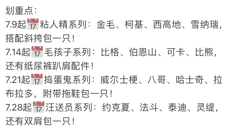 同时,每只狗狗还会搭配一个配件,也是一周上一款,有抱抱座卡包、纸尿裤磁吸肩宠、可爱拖鞋小挂件、外卖袋小布包。