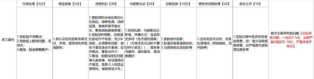 刘国祥给我发来一张表格,清晰的标注出30分给流程执行、20分给互动表现、10分给自我创新、5分着装、5分道具准备。还有更细节的注意事项,在火锅店给正在吃饭的食客突然表演变脸需要注意什么?比如音响不能太大否则容易吓到顾客、喷火注意烟雾报警器、注意不要吓到小孩子。