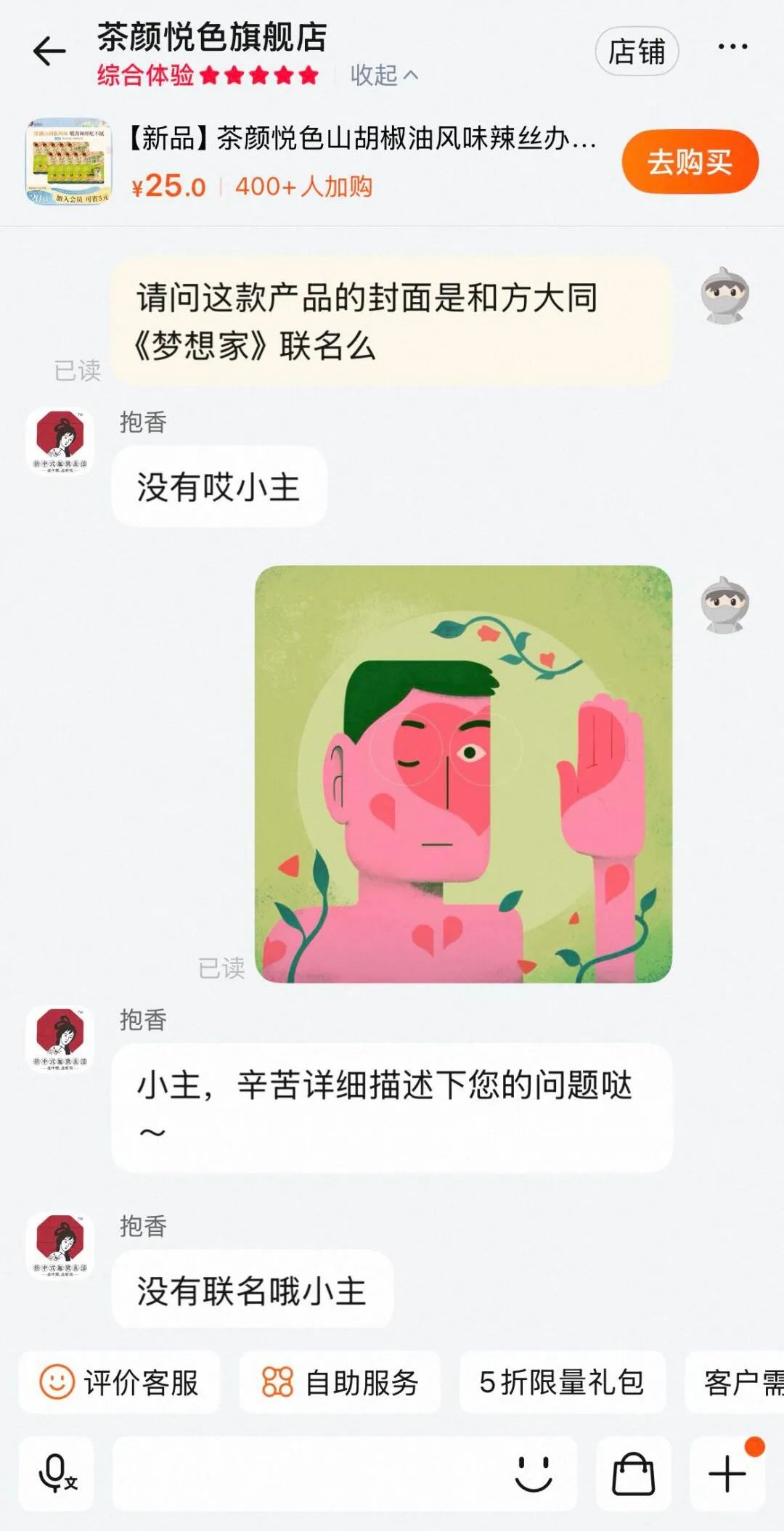 在山胡椒油风味辣丝的包装上,一位女孩在听音乐,手中拿着一张正方形的“纸”。不少网友认为这张“纸”与方大同于2024年10月发行的专辑《梦想家(The Dreamer)》的封面非常像,虽然眼睛鼻子嘴巴没有了,但配色和图形轮廓都极为相似。