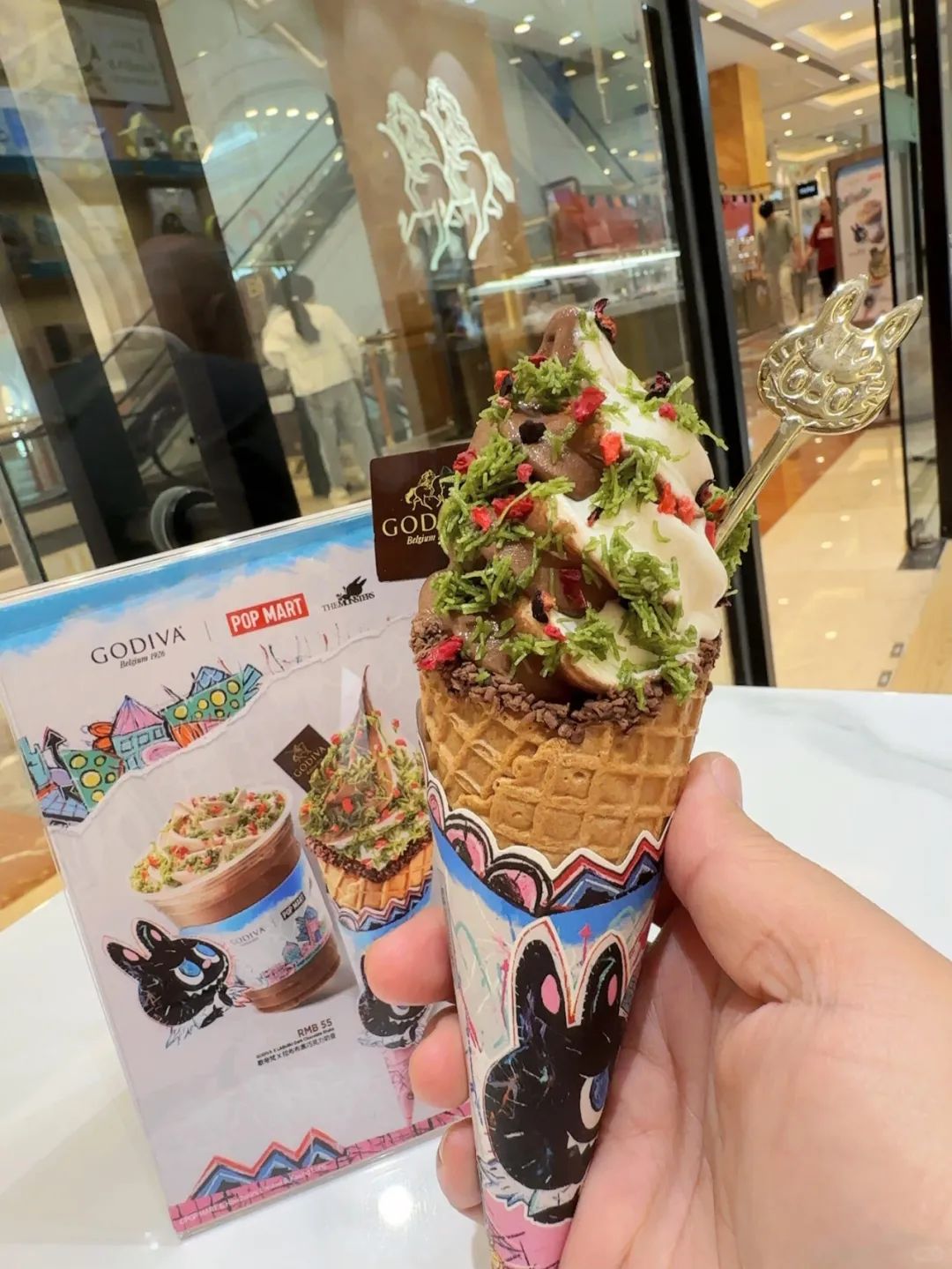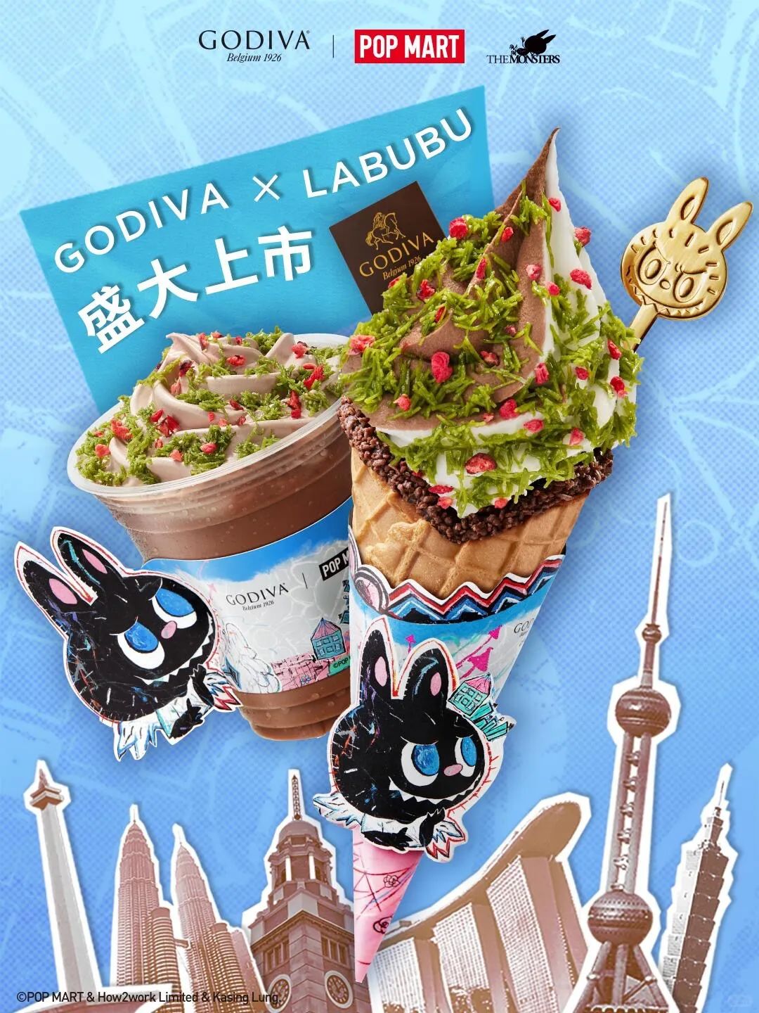 7月15日,比利时巧克力品牌GODIVA官宣联名泡泡玛特旗下潮玩IP LABUBU,GODIVA将森林精灵的冒险故事融入设计,以“遇见你,怪巧的!”为联名活动口号,推出 三款软冰淇淋(黑巧、白巧、双巧)和两款特调奶昔(牛奶巧克力、黑巧克力)。冰品使用了GODIVA经典巧克力、四种混合莓果 冻干 及开心果面包丝酱 。