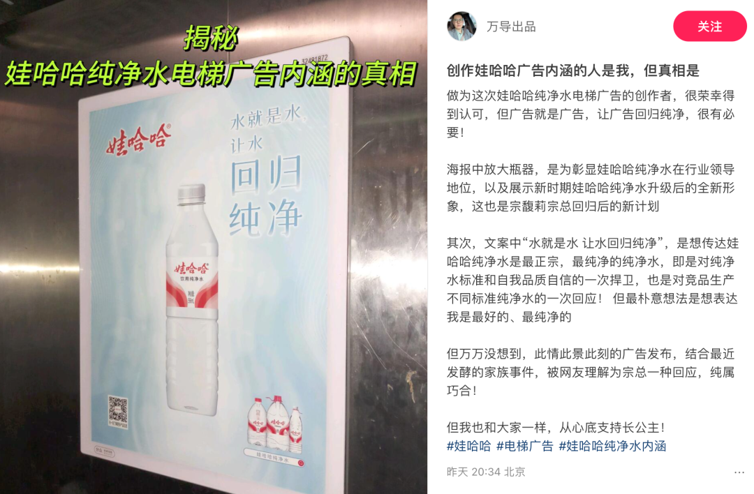 宗馥莉被同父异母弟妹起诉,这场涉及300多亿的遗产之争暂且没有下文,有网友发现,娃哈哈纯净水的电梯海报更新了,文案似乎意有所指?