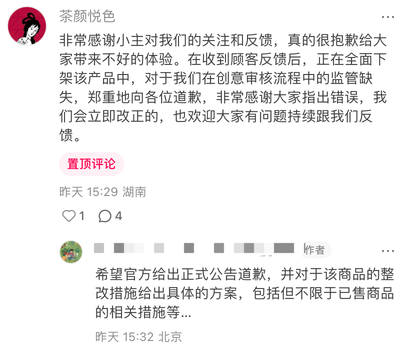 于是,网友在小红书就此事发布帖子,茶颜悦色官方账号在帖子评论区回复道歉,但网友表示希望品牌方能正式公告致歉,并给出具体的解决方案。