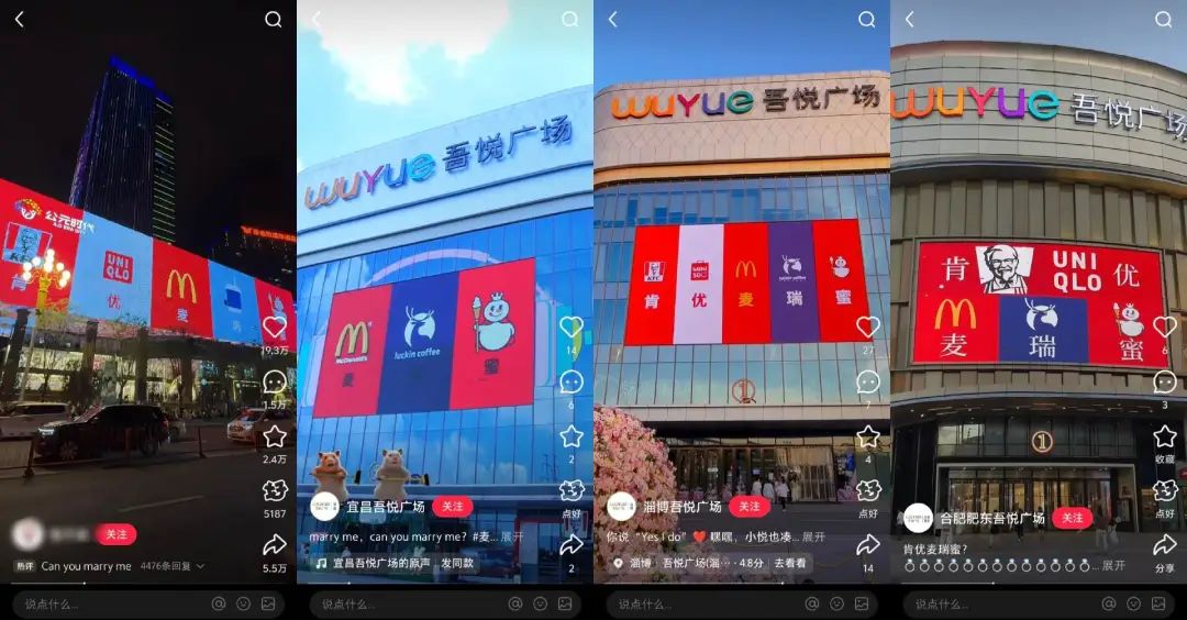很快,各地商场都加入了这场“肯优麦瑞蜜”的大屏玩梗中来,这几位品牌真是火出圈了。