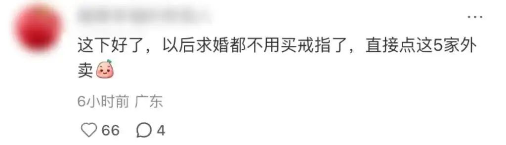 以后求婚都不用买戒指了,直接点这五家的外卖——肯德基的炸鸡、麦当劳的汉堡、瑞幸的咖啡、蜜雪的奶茶,再让中国邮政送上门,一套“求婚套餐”齐活,仪式感和梗都有了。