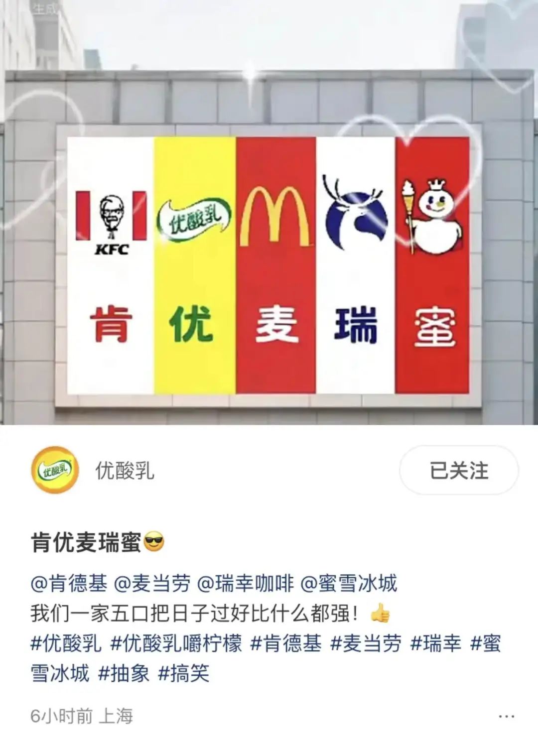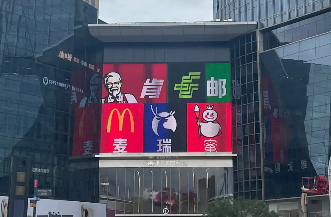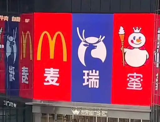 最近冲浪的时候突然被一张照片逗乐了,武汉一商场的大屏不按常理出牌,把麦当劳、瑞幸、蜜雪冰城这三个“老熟人”的 LOGO 凑到了一块儿:麦瑞蜜,阿广当场就笑出了声。