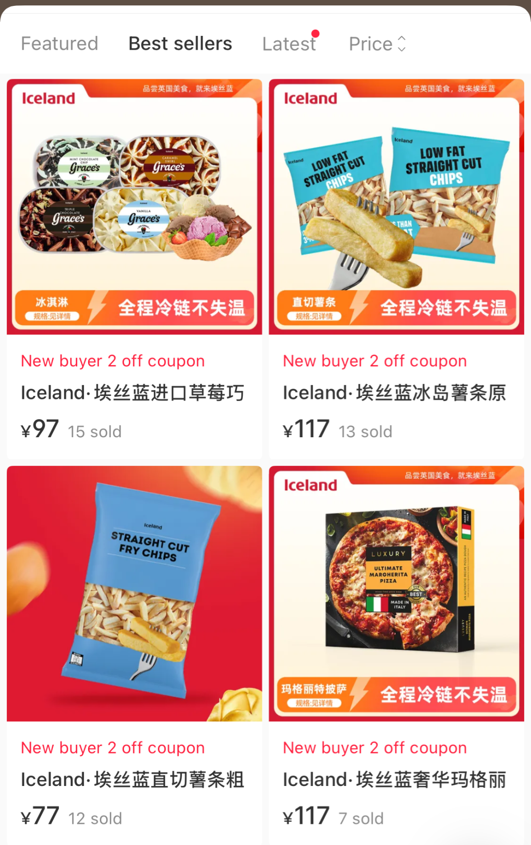 虽然宣称“1英镑”披萨也搬到了国内,但只有线下少量临期货真的做到了1英镑左右(9块9人民币),且常常断货。而Iceland网店中的“奢华玛格丽特披萨半成品”单价59.5元,2包900g的半成品薯条售价79元,两盒Iceland自营的“格蕾丝香草冰淇淋”则卖到了99元。