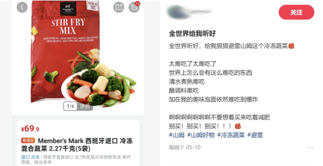 比如山姆的冷冻蔬菜就标注了“西班牙进口”,一大包里面有切好的西蓝花、胡萝卜条和玉米块。特地从西班牙把菜冻好了运过来看起来多此一举,也确实没能提升味觉体验,吃过的人评价,“像在吃泡发了的干尸”。