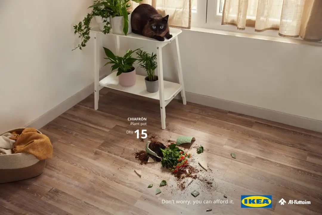 宜家所呈现的内容鲜活且富有温度,让人感觉触手可及。其中写实的场景、活泼的动物元素,赋予了内容灵动的生命力。如,在猫狗打碎花瓶的场景里,搭配文案“别担心,你负担得起”,将产品与消费者的日常生活紧密相连,让消费者在遇到类似场景、产生相关需求时,能够立刻想到宜家,使宜家内容的感染力发挥到了极致。