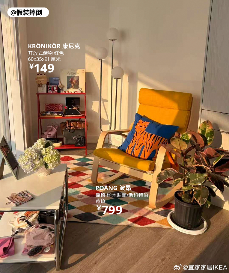 在这组场景,每一处都透露着舒适与惬意,再加上宜家的文案「下班回家只想瘫成泥?这些“充能”小角落帮你在家放假!吹空调晒太阳,还能随地大小躺~ 」,人们在家的轻松、随性与慵懒感立马跃然纸上,想让标着价格的产品成为家庭中的一员。