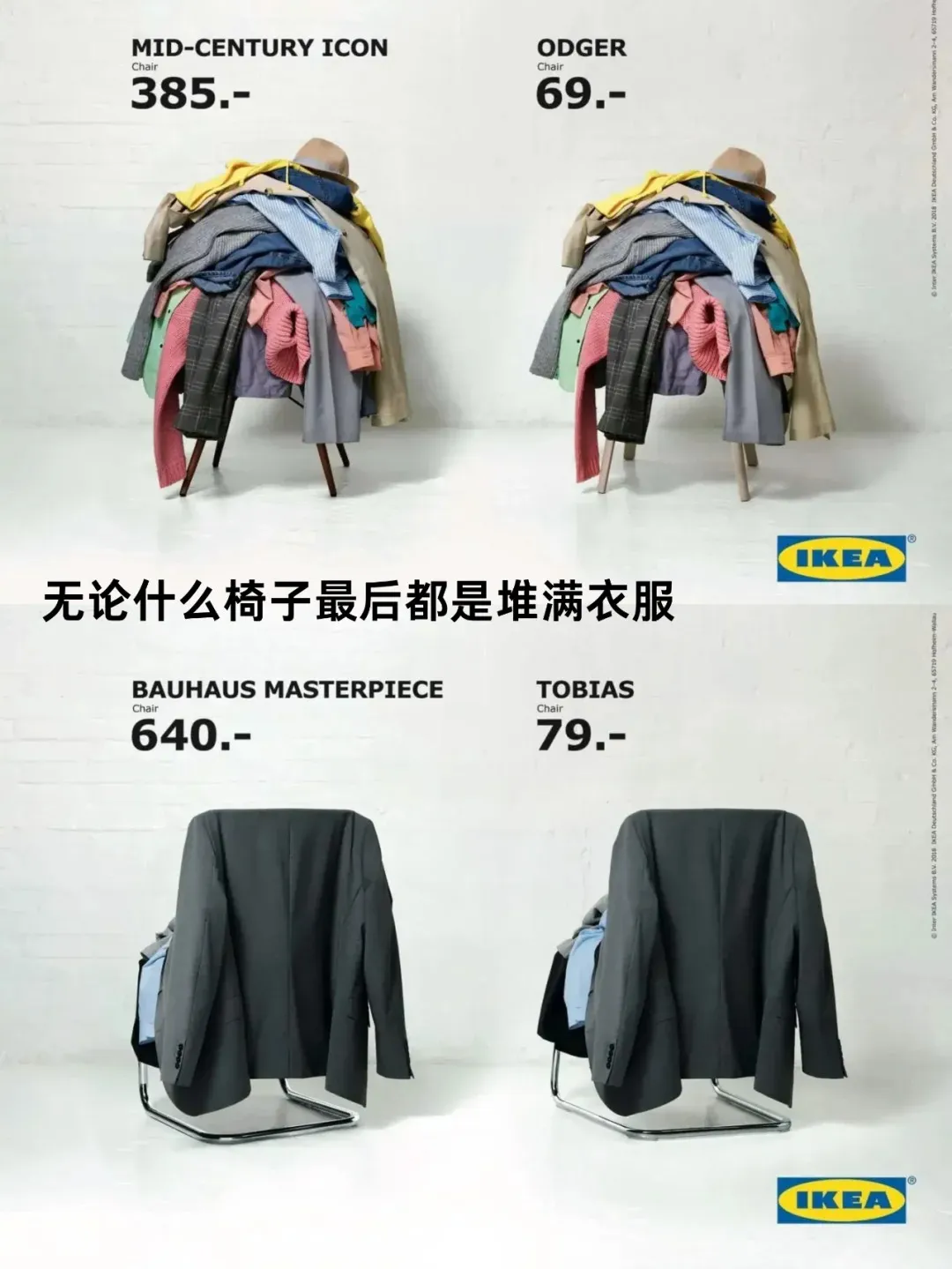 另一种带着模糊期待(逛着逛着才被触发需求),品牌要像魔术师一样,很自然的掀开产品的"隐藏用法",比如椅子的基础功能是让人们“稳定、舒适、安全地保持坐姿”,但宜家把家里椅子变成了消费者的“临时衣柜”,看见广告后,不少用户感叹道“太写实了”!