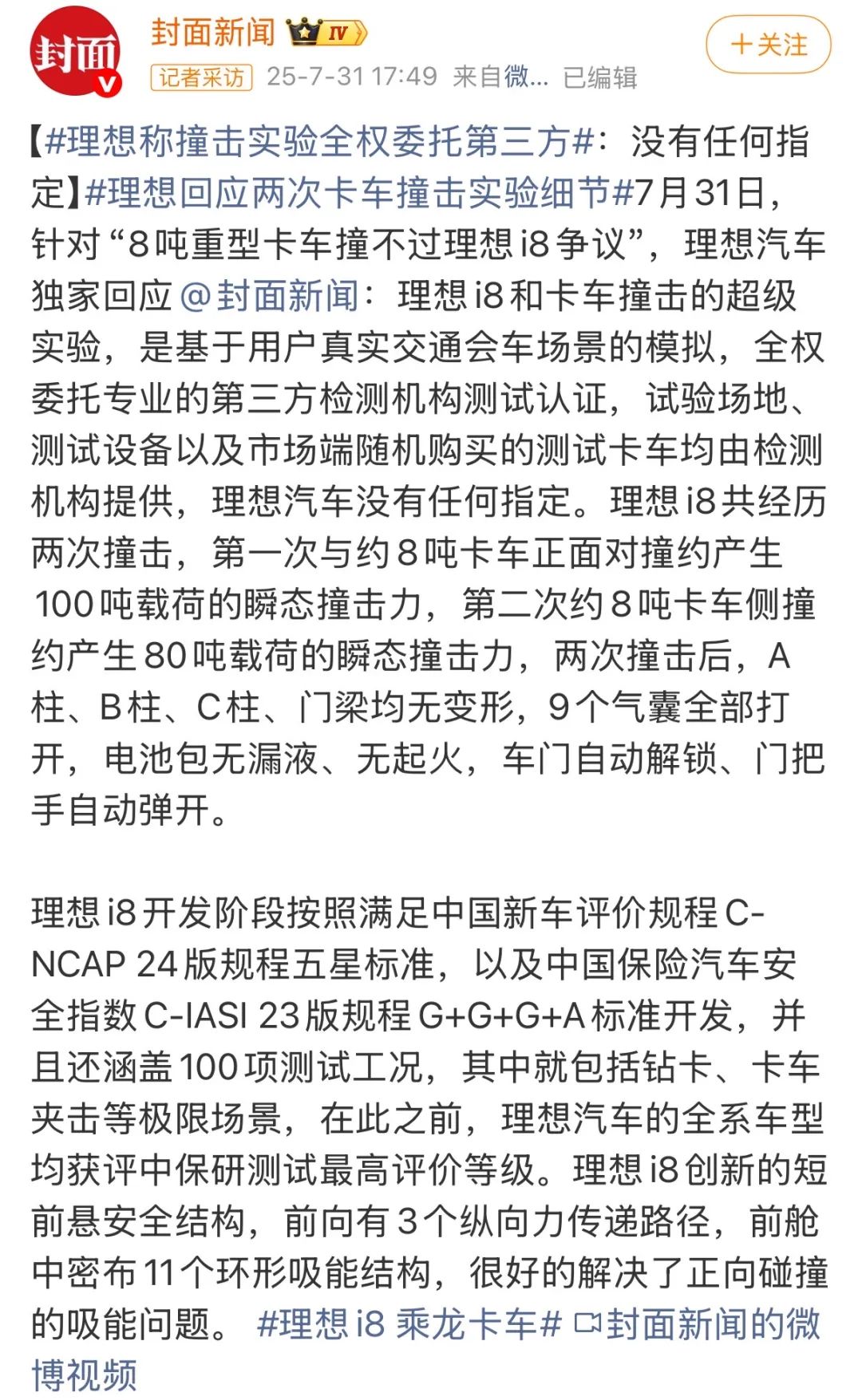 在两人转发的这条新闻帖子中,可以看到,理想汽车官方回应称实验是全权委托专业的第三方检测机构测试认证,试验场地、测试设备以及市场端随机购买的测试卡车均由检测机构提供,理想汽车没有任何指定。