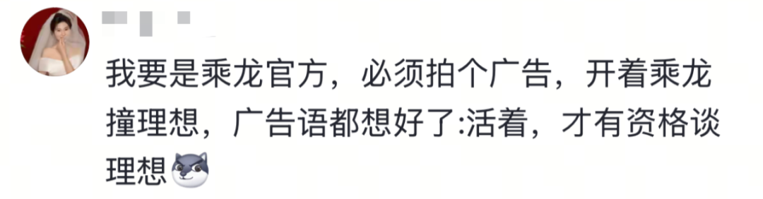 同时,网友出损招拱火乘龙卡车,建议官方拍个广告,开着乘龙撞理想,广告语就是:活着,才有资格谈理想。