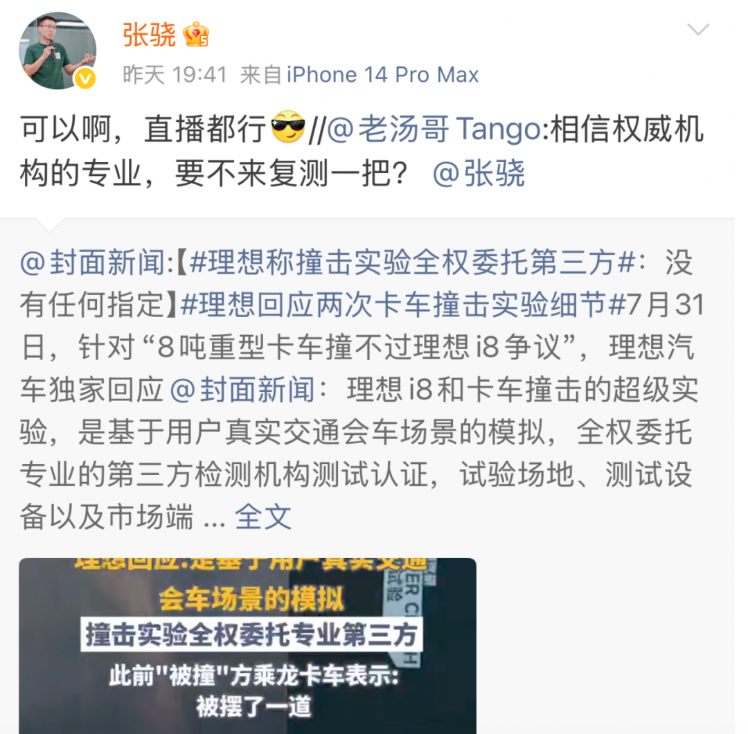 7月31日,理想汽车的产品线负责人@老汤哥Tange 和@ 张骁 两人在微博隔空对话,自信提及直播复测。