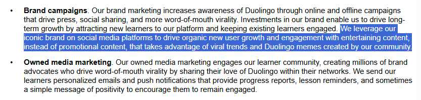 然而,多邻国最巧妙的策略就是不用烧钱来解决拉新问题。可以看到,尽管公司的用户规模和品牌心智在快速增长,营销费率却在不断下滑。