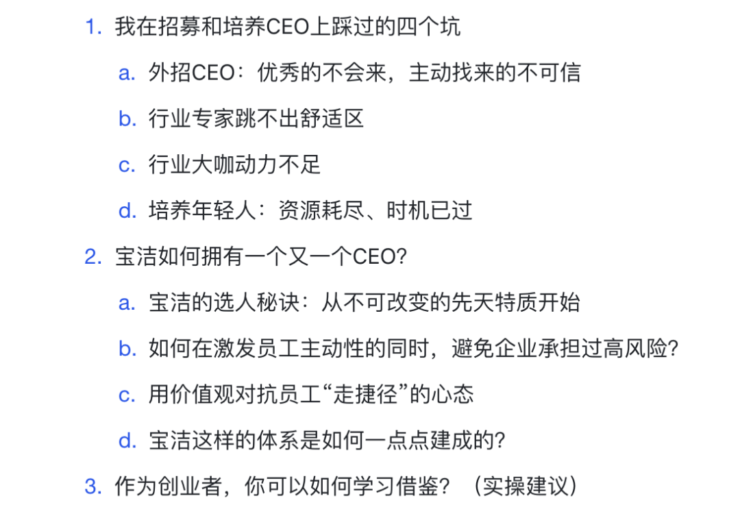 后来,在和更多宝洁人深入交流后,我逐渐意识到,在获取CEO上,培养远比招募更可执行,并且更符合企业的长期发展诉求。