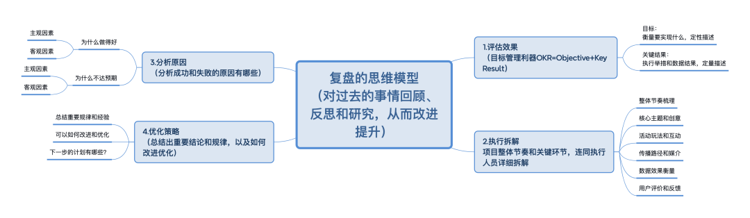 最后推荐几个比较好用的营销项目复盘模型,大家可以根据自身的习惯和喜好,以及具体的项目场景选择最为适合的复盘方法。