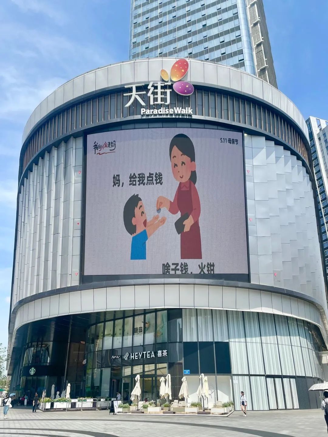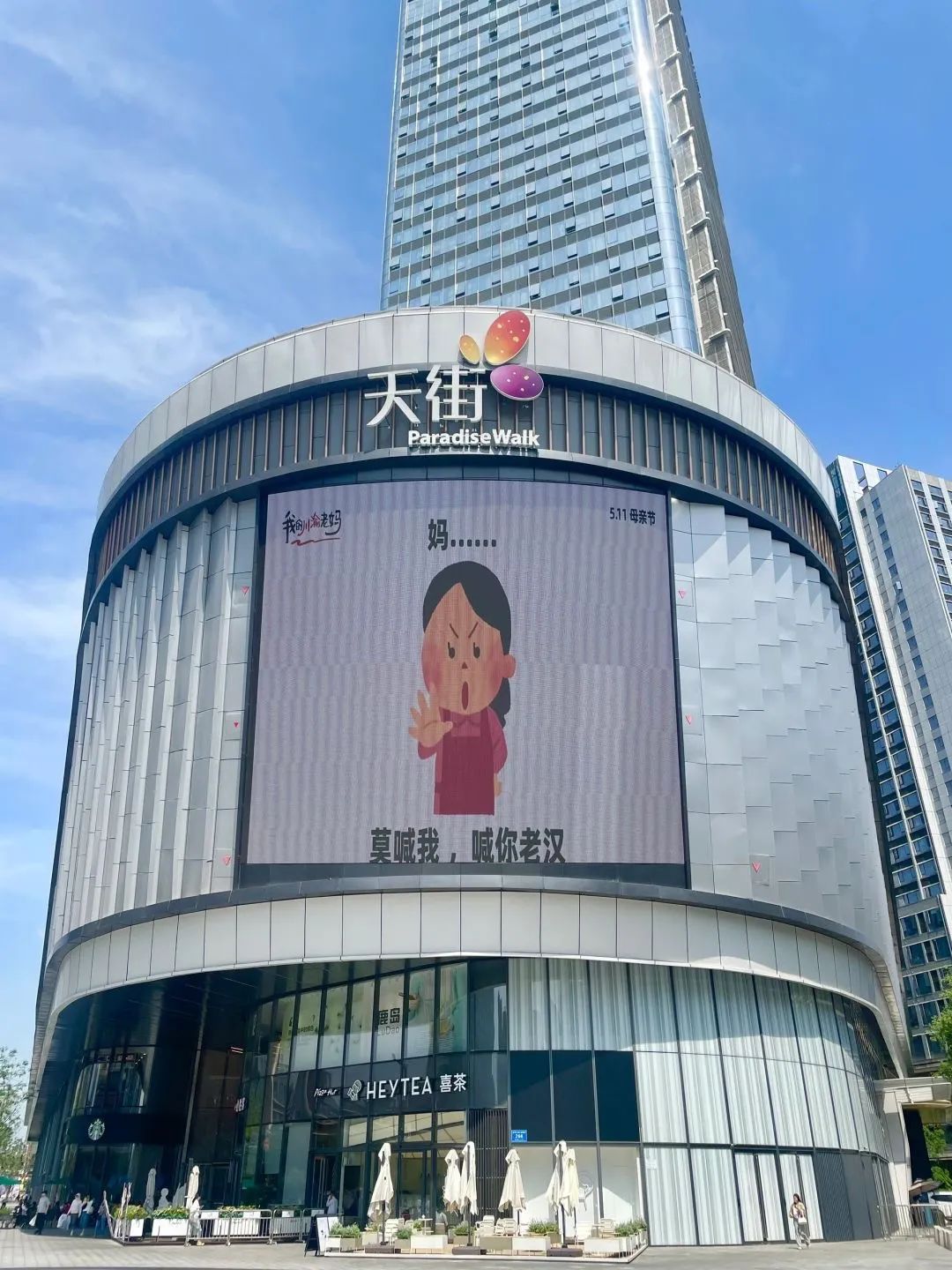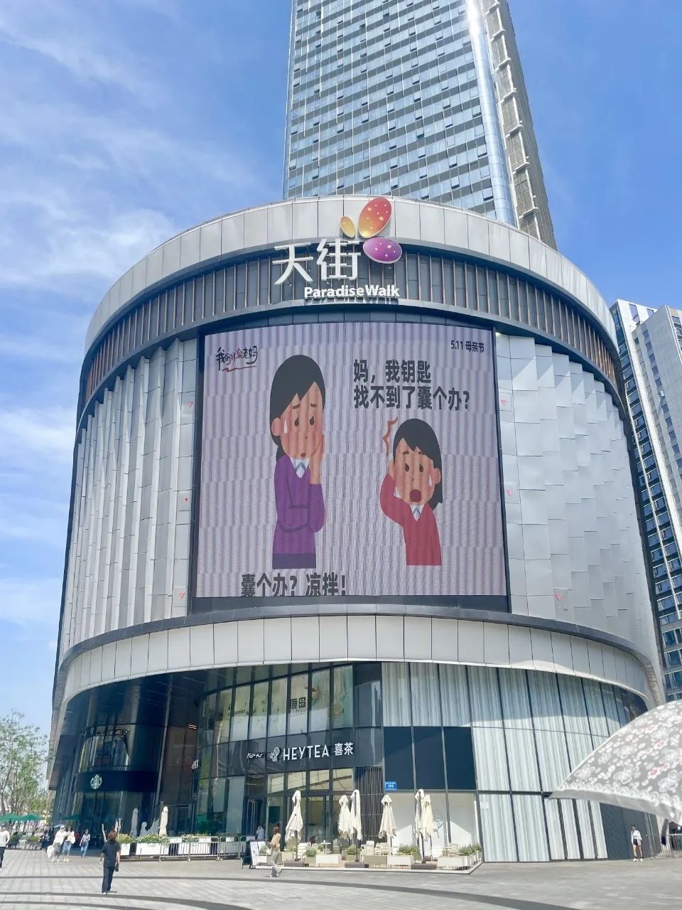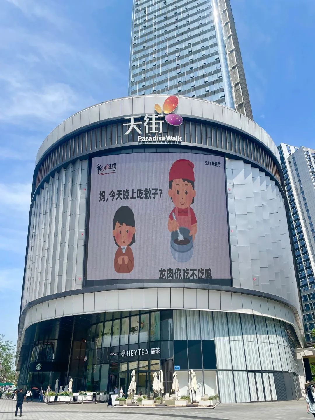 今年母亲节,成都滨江天街商场联合日本插画小人(irasutoya)表情包分享博主@毛桃同学 ,在户外大屏上轮播《我的川渝老妈》系列抽象海报。海报文案疯狂输出川渝妈妈们的“鼓励式打击”,配合“irasutoya”幽默诙谐、表现力极强的人物表情,让我们看到了刀子嘴豆腐心、又辣又飒、比喻鬼才的川渝妈妈形象。不少川渝网友看了表示,还真是我妈妈说过的话,同一个川渝同一个妈。
