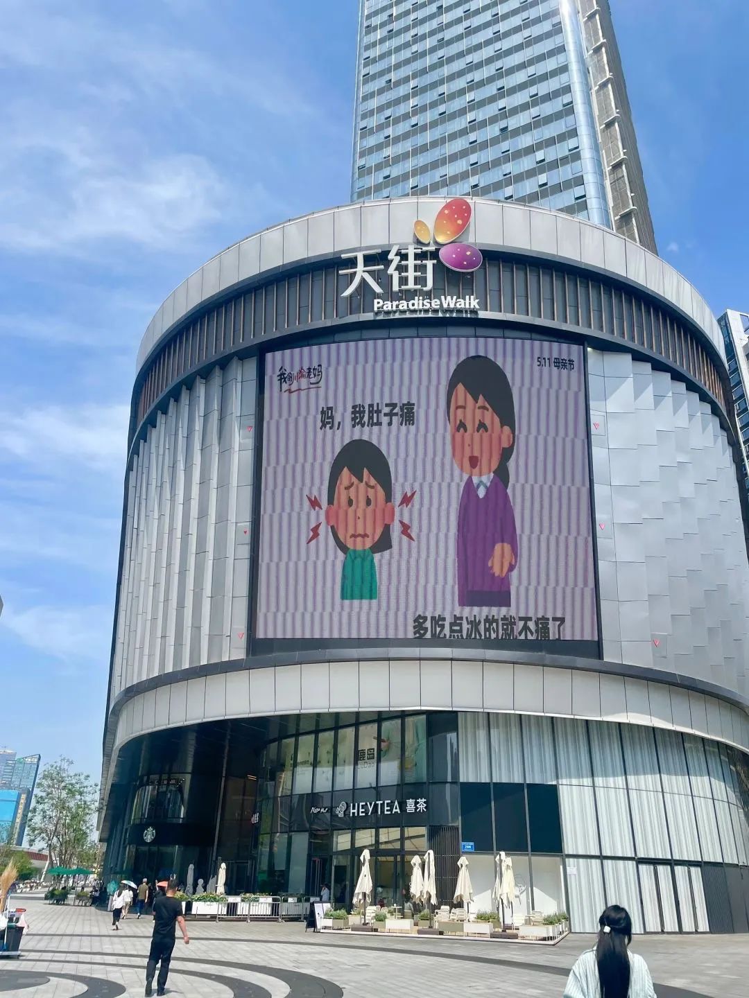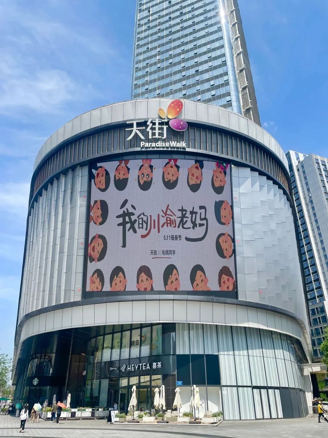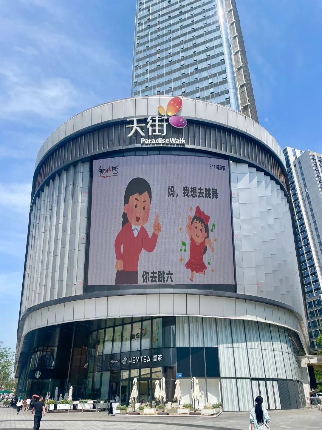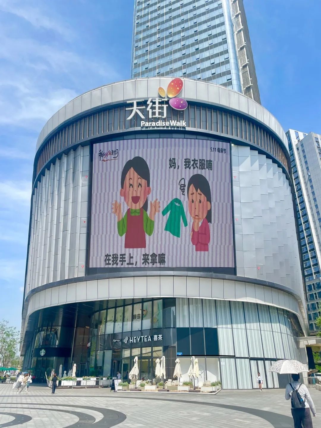 今年母亲节,成都滨江天街商场联合日本插画小人(irasutoya)表情包分享博主@毛桃同学 ,在户外大屏上轮播《我的川渝老妈》系列抽象海报。海报文案疯狂输出川渝妈妈们的“鼓励式打击”,配合“irasutoya”幽默诙谐、表现力极强的人物表情,让我们看到了刀子嘴豆腐心、又辣又飒、比喻鬼才的川渝妈妈形象。不少川渝网友看了表示,还真是我妈妈说过的话,同一个川渝同一个妈。