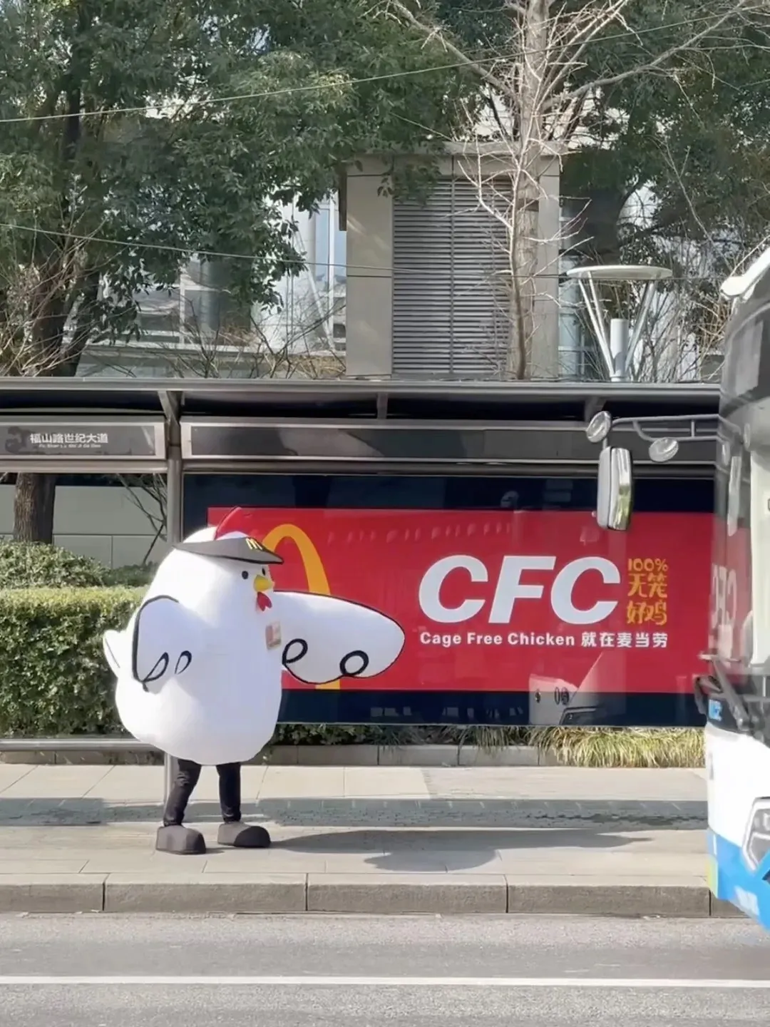 麦当劳投放 车站海报 推广品牌“ CFC无笼好鸡Cage Free Chicken)概念。官方宣称30多年来坚持使用非笼养殖的白羽鸡。车站前,有工作人员身穿白羽鸡玩偶服,站岗给劳铁们(麦当劳的铁子们)合影。