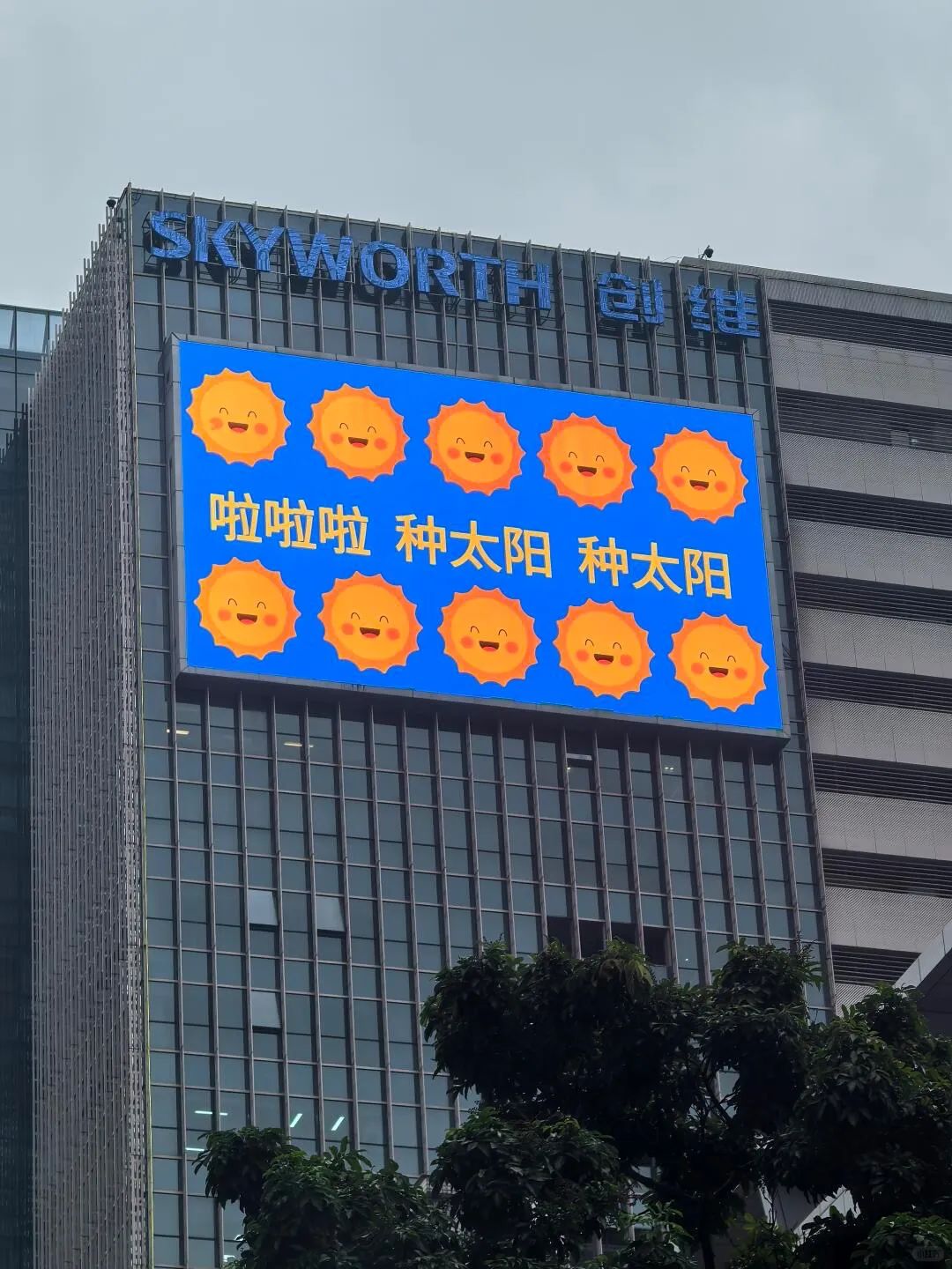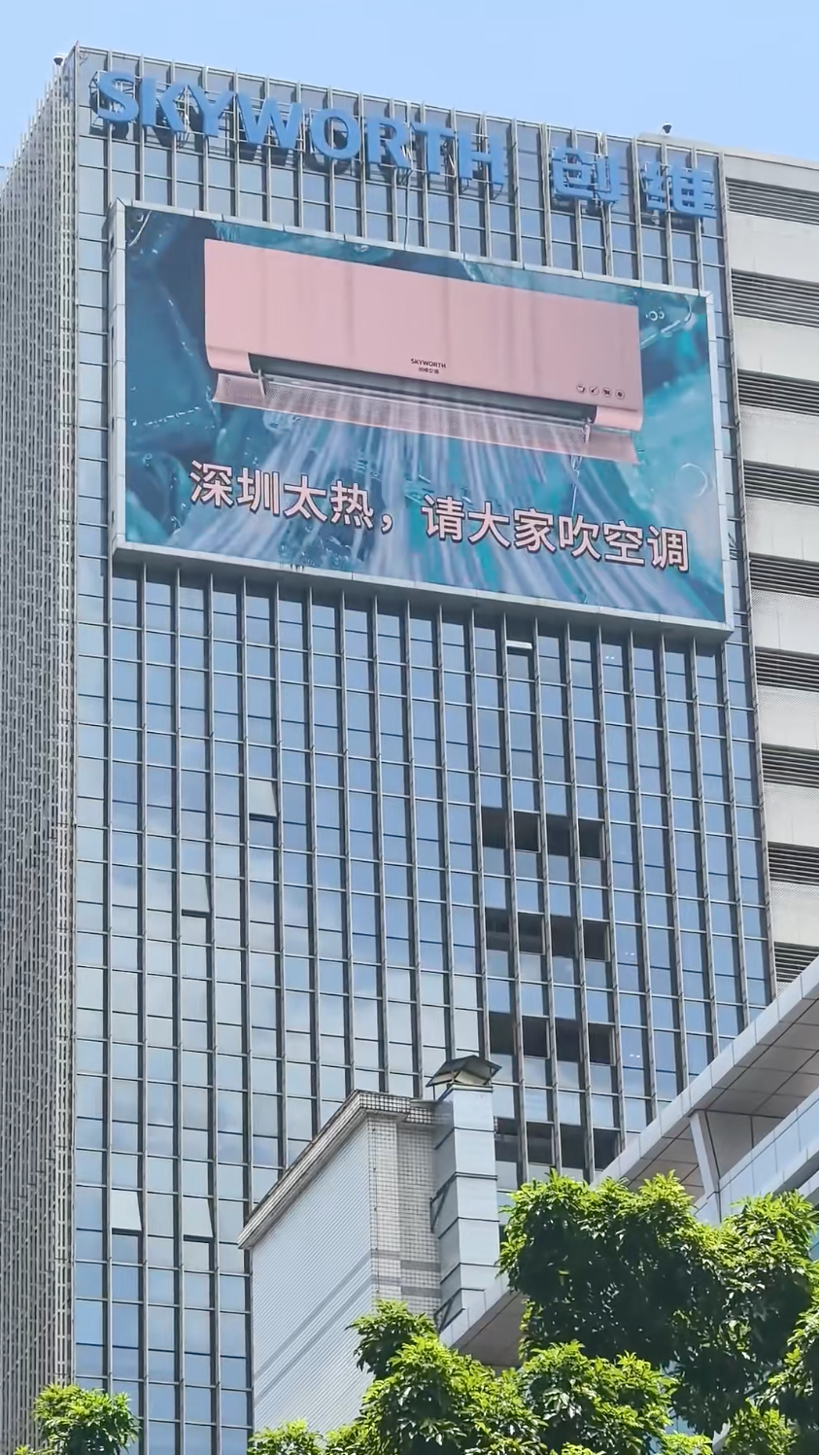 七八月份的深圳,台风暴雨、太阳暴晒轮番上阵,坏天气让日子变得难熬。南山科技园的创维总部大厦在户外大屏上自导自演玩起了小品,一会儿“种太阳”,碎碎念求雨停,一会儿又搬出赛博空调为人们降温。创维的大屏成为了深圳人的嘴替,借着对天气的“发疯式”吐槽,创维激发人们的心理共鸣,以“零成本”引来不少路人的关注。