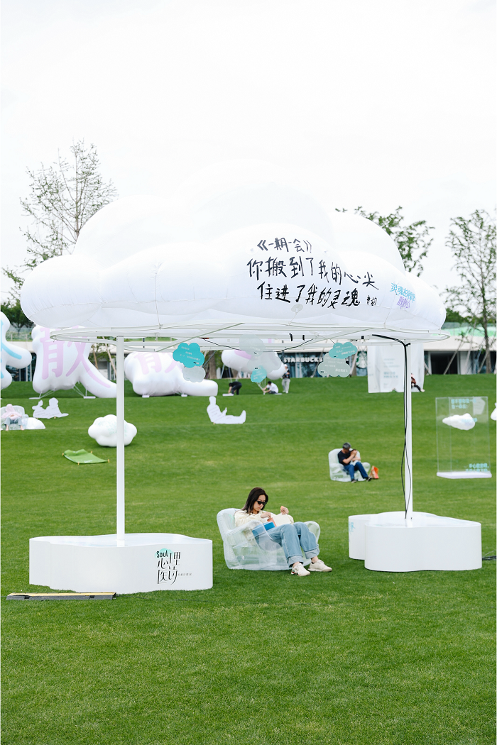 5月底至6月初,Soul APP携手“宛平南路600号”(上海市精神卫生中心),在世博文化公园举办「心理医诗」治愈诗歌展3.0,将“治愈诗歌展”IP升级,举办治愈诗歌展、音乐会和端午诗歌市集活动。品牌将线上“轻疗愈”玩法搬到线下,其中,在治愈诗歌展上,纯白色云朵、座椅、充气滑梯、风筝、镜子、假门等20多组趣味装置掉落在公园绿地,供年轻人躺着,坐着,滑滑梯,荡秋千……这些装置承载着温暖人心的诗歌文字,是品牌打造的“情绪处方”。通过为年轻人提供“沉浸式”情绪出口,进而补位社会心理服务的“中间地带”,品牌得以加深情绪价值和心流体验的用户心智,与用户构建更强的链接。