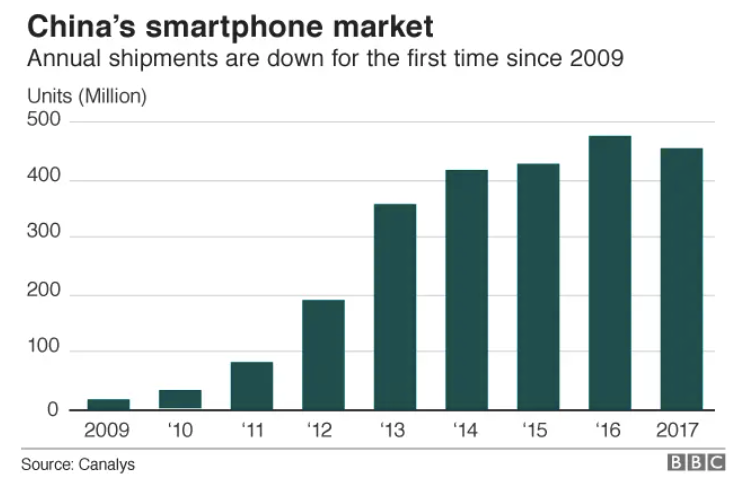 2017年,中国手机市场全年出货量下滑了4%,这是中国手机市场8年快速增长之后的首次下滑,也是中国手机市场第一次出现饱和状态。