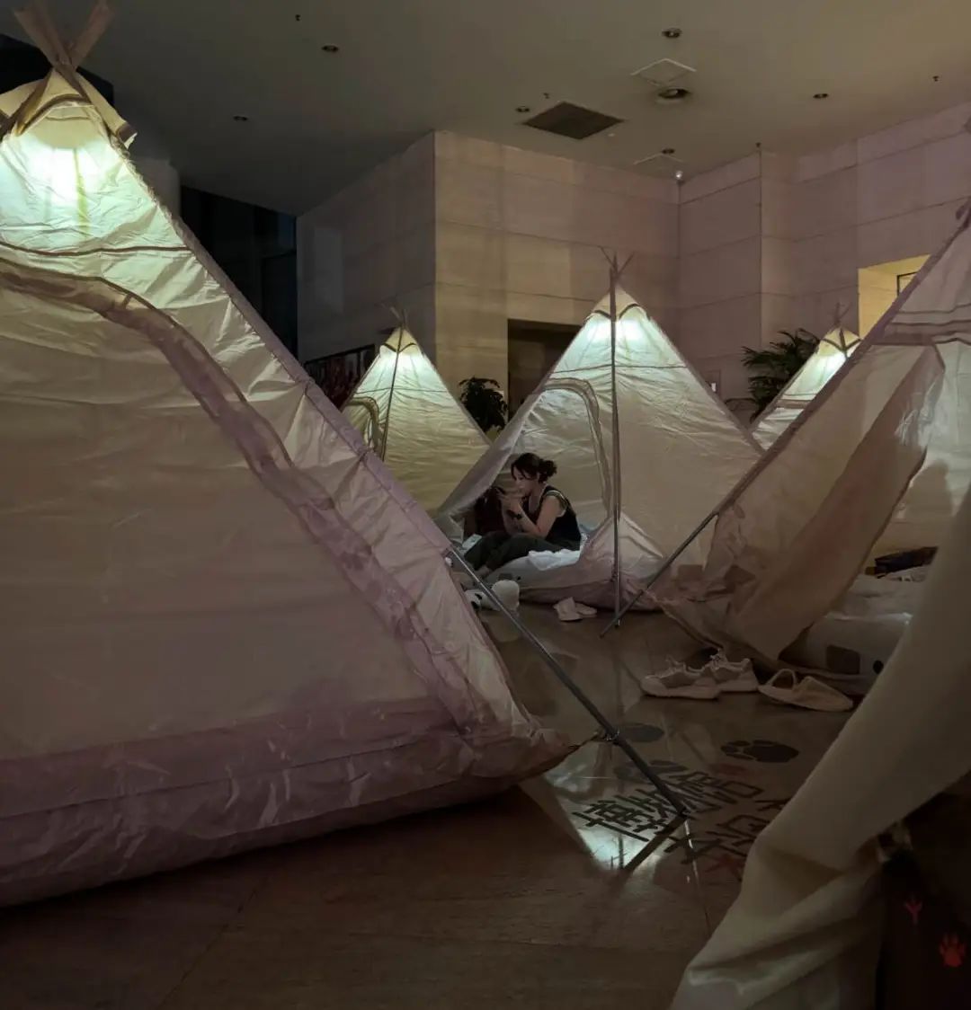 “我刚开始还是挺兴奋的,但晚上听课真的太困了,后面都快站着睡着了”,李昭诺觉得这个展应该改名为「寻找夜猫子」。有的人蹲在墙角休息,有的人坐着灭火器靠着墙睡,还有的父母直接在地下铺张床单,小孩儿倒地就睡。