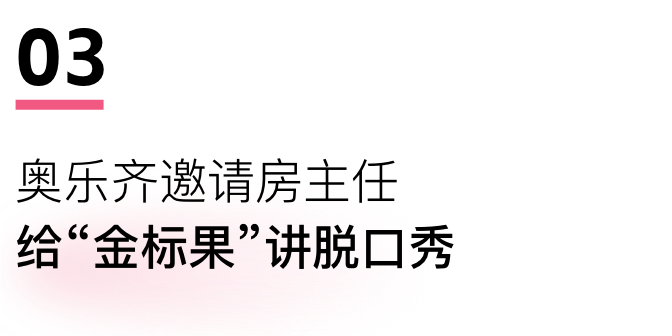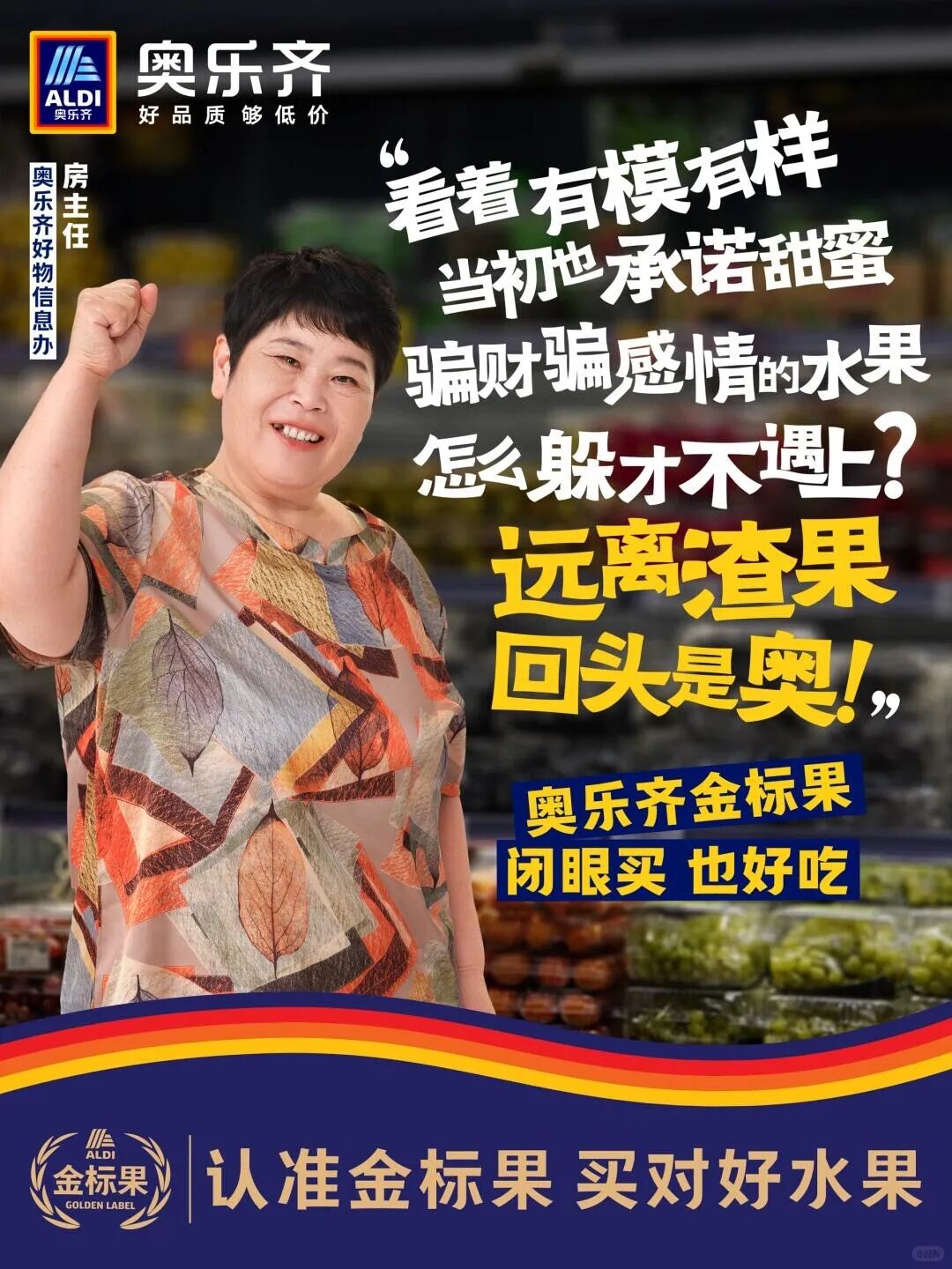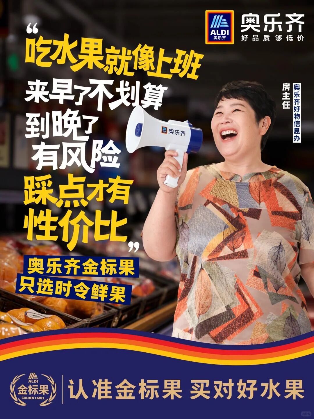 9月,主打超值低价的连锁超市奥乐齐开始推广自有品质标识“金标果”——蓝莓、石榴、苹果等水果已进入 黄金赏味期。超市以“ 认准金标果,买对好水果”为核心理念, 邀请到脱口秀演员房主任,担任奥乐齐好物信息办主任, 帮助年轻人挑水果 。 房主任曾在综艺《喜剧之王单口季》第二季中以荒诞口吻回忆苦涩往事,带着女儿勇敢挣脱不幸婚姻牢笼的自立故事获得了巨大关注和赞赏。