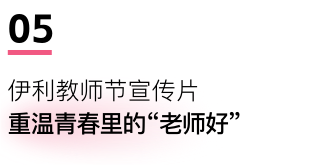 演员陈好的另一重身份是中央戏剧学院表演系的老师。今年9月10日教师节,在伊利发布的宣传片 《老师好》 中,陈好引领观众一同回忆学生时代的“老师好”:有刻进肌肉记忆里的,有硬着头皮说的,有成为彼此暗号的,还有发现老师小秘密的“老师好”……这些 真实、生动又有趣的小插曲,赋予“老师好”一声招呼更多含义, 引发观众的共鸣。同时,品牌借宣传片 对老师群体表达了感谢。片尾顺其自然地从老师的教诲联系到产品“ 好的营养,是一辈子的滋养”,没有硬上价值,整体观感舒适。