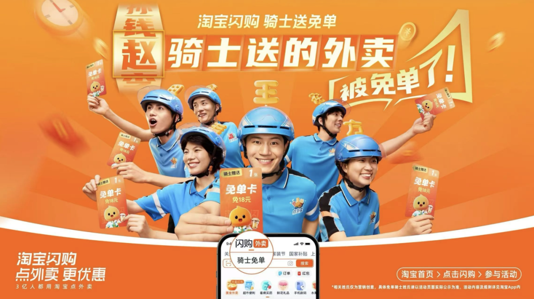 随着外卖大战的愈演愈烈,骑手成为了每个人生活中最熟悉的陌生人。我们管他们叫小哥、外卖、放门口,却鲜少会关注到这些骑手真正的名字。为此,淘宝闪购特别发起「骑士送免单」企划,将免单福利与骑手姓名精准绑定——当配送骑士的姓氏与当日幸运姓氏匹配时,用户即有机会获得平台提供的18元免单卡,引导大众去主动关注这群在路上的「无名的人」。
