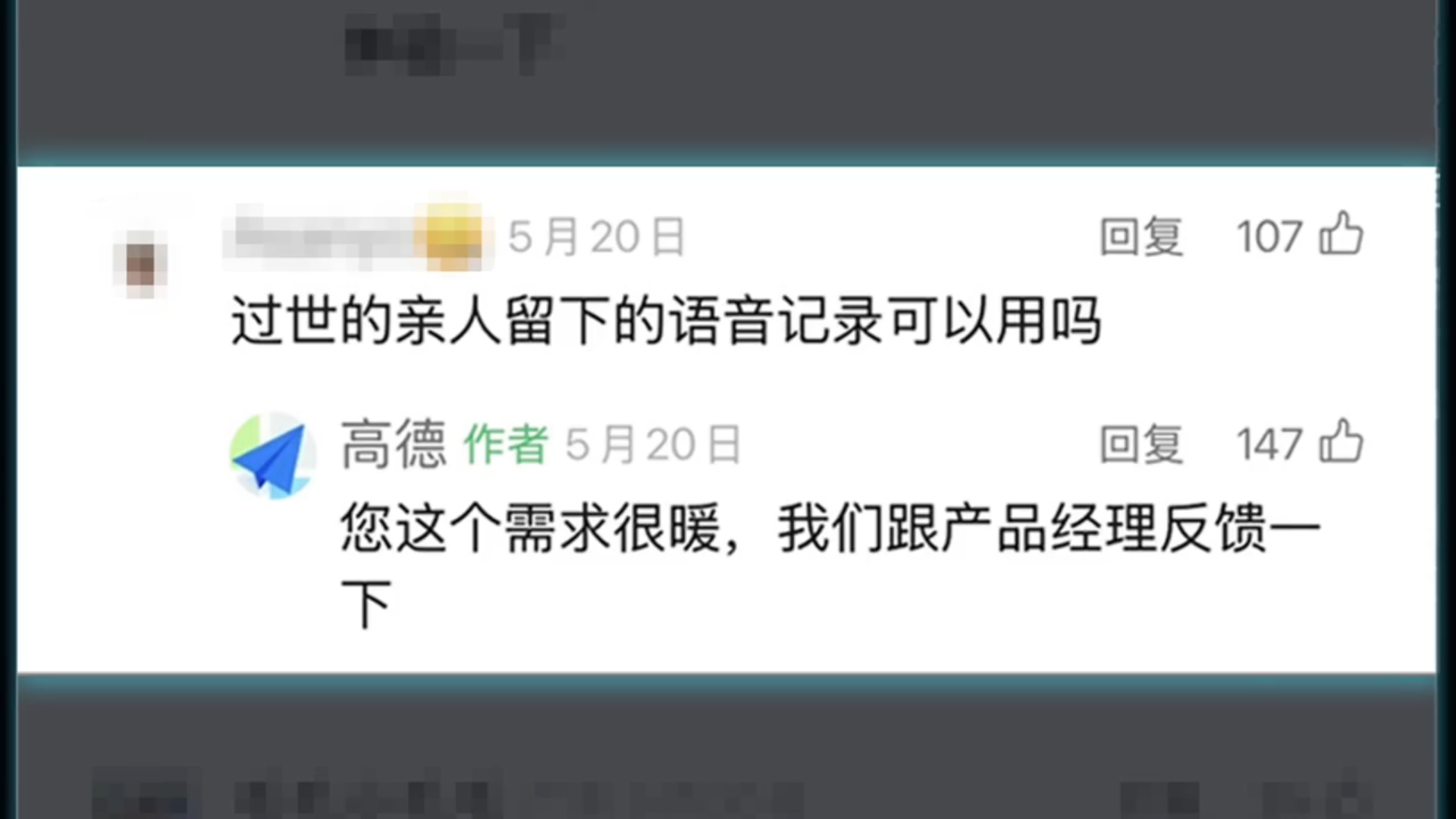 今年5月,高德地图更新了自制语音导航功能,评论区一条「能否使用过世亲人语音记录」的留言引起了官方的注意。团队迅速与这位用户取得联系,通过语音大模型技术帮助她再度「听见」已故父亲的声音,让孤单的前行之路从此又有了令人安心的陪伴。