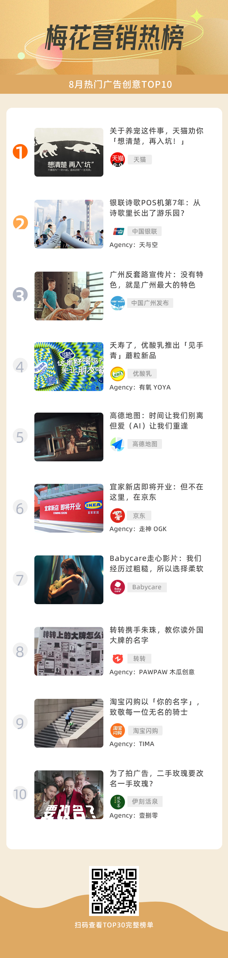 梅花营销热榜 是梅花网基于平台收录作品的点击数、喜欢数、收藏数等数据综合得出的创意榜单,八月榜单新鲜出炉!本期上榜的案例可以说是有点真洞察在,包括:对社会情绪的把握,对消费者期待的承接,还有对文化元素的创造性运用。品牌将营销内容打造成可以与用户深度连接的话题,让自身的产品/服务成为一种社交货币,推动了大规模的二次传播。