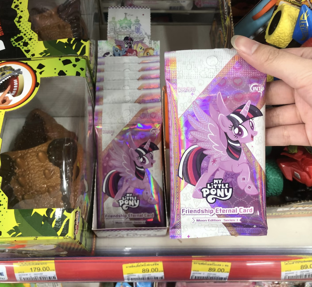 从2024年底开始,泰国很多711便利店的货架上,出现了一款国内用户熟悉的商品:闪着五彩光线、装在密封袋里的小马宝莉卡牌,几乎和国内卖的一模一样。