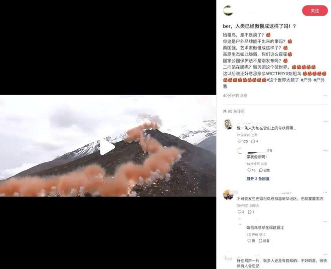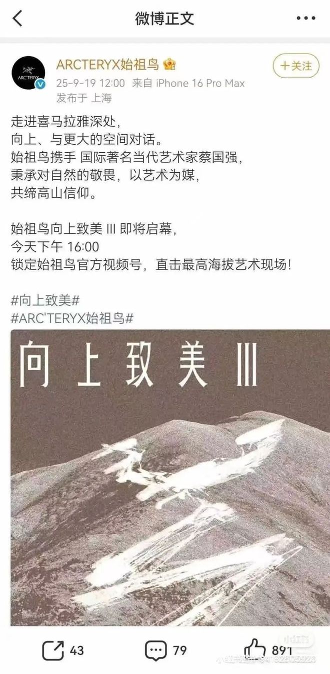 由于此事一经发布就在全网遭遇热议和抵制,蔡国强和始祖鸟都火速删除了相关推广素材。但网友还是留下了一些证据,比如: