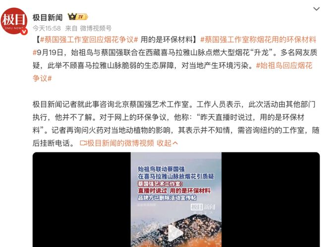 @极目新闻 记者就此事咨询北京蔡国强艺术工作室。工作人员表示,此次活动由其他部门执行,他并不了解。对于网上的环保争议,他称:“昨天直播时说过,用的是环保材料”。记者再询问火药对当地动植物的影响,其表示并不知情,需咨询纽约的工作室,随后挂断电话。