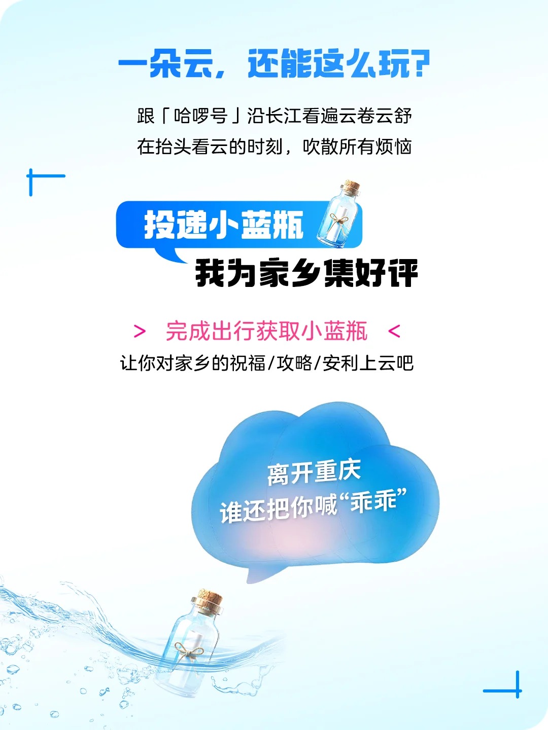 活动中,用户可通过哈啰App“小蓝瓶”上传“家乡代言”文字,内容有机会实时展示在“哈啰号”的互动云屏上;同时,这些用户内容还会以“云朵车挂”的形式投放在多城市的哈啰单车上,实现线上线下的多维互动。