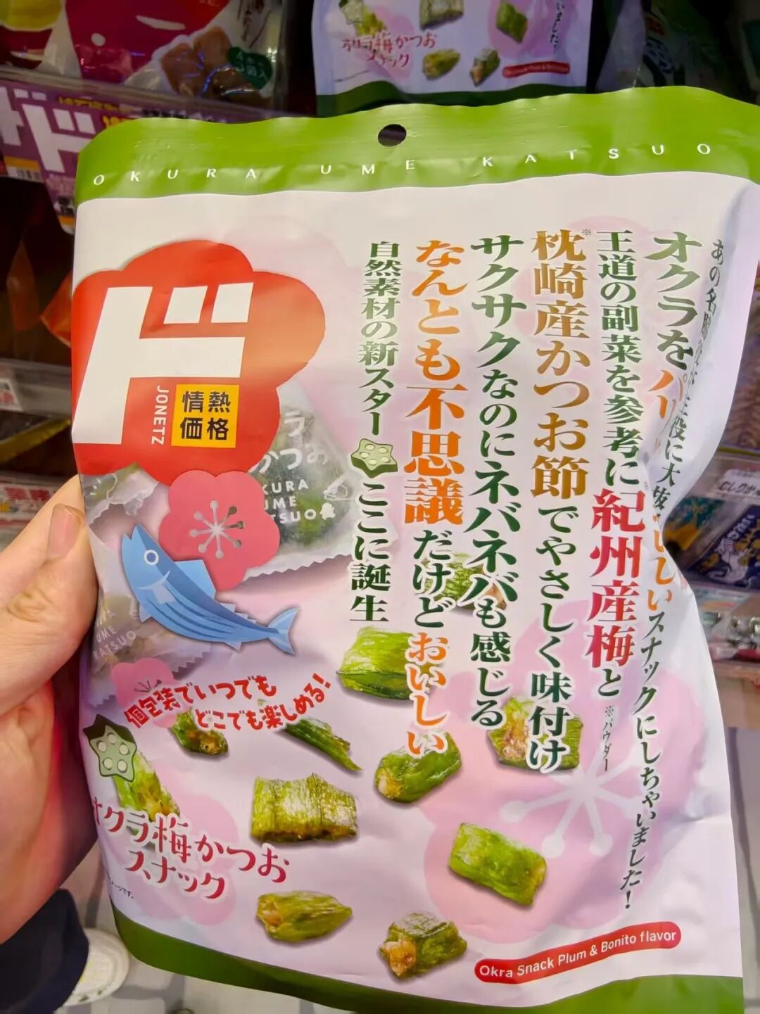 再比如这个:为了能像饭团一样轻松享用,我们以经典的副菜为参考,用纪州产的梅子和枕崎产的鲣鱼干,将秋葵温柔调味。外皮酥脆,内里却是Q弹黏糯的口感,听着不可思议,味道却十分美味。这款由天然食材制成的新型麻薯就此诞生。