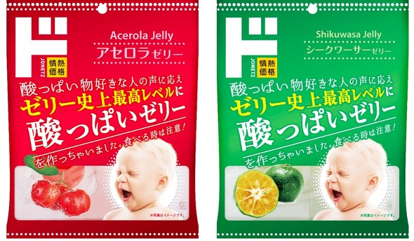 这款酸味果冻共有柠檬、橙子等四种口味,每一种口味的包装上,都写着“为响应爱吃酸人士的需求,我们打造出了一款果冻史上酸度最高的果冻,吃的时候可要注意哦!”文案采用倾斜设计,且从右到左字号逐渐变大,仿佛漫画里拿喇叭喊出来的“惊喜通知”。