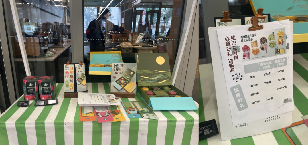 而来到北京华堂·新辰汇的星巴克门店,店家甚至直接在门外设有专门的月饼台,将月饼放在最醒目的地方。低头只瞅了十秒左右,店长就大步流星地走了出来,然后熟练地报出一系列比售价单上更低的数字,精确到小数点后一位:“现在买月饼可以享员工内购7折价,还是比较划算的,358打折下来是250.6,468打折下来是327.6,目前内购券还有五张,再过两三天买就不一定有了。”