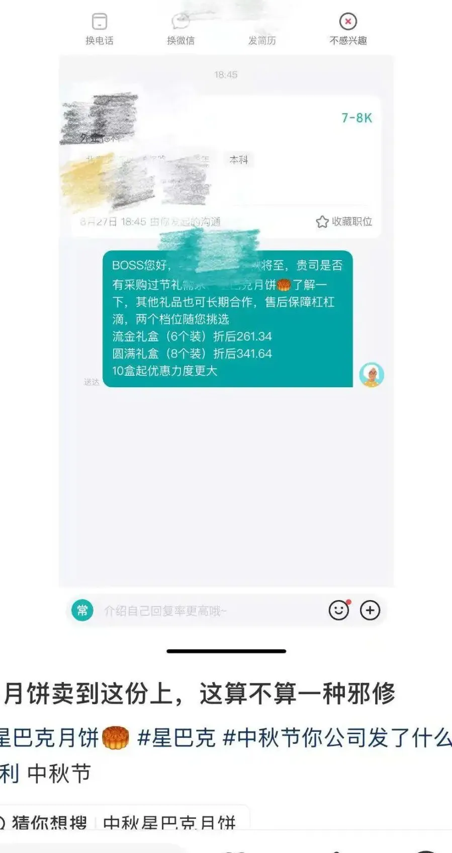 还有人勇闯BOSS直聘,不为跳槽只为卖月饼,以前是“找工作我要和老板谈”,现在是“卖月饼我要和老板谈”。
