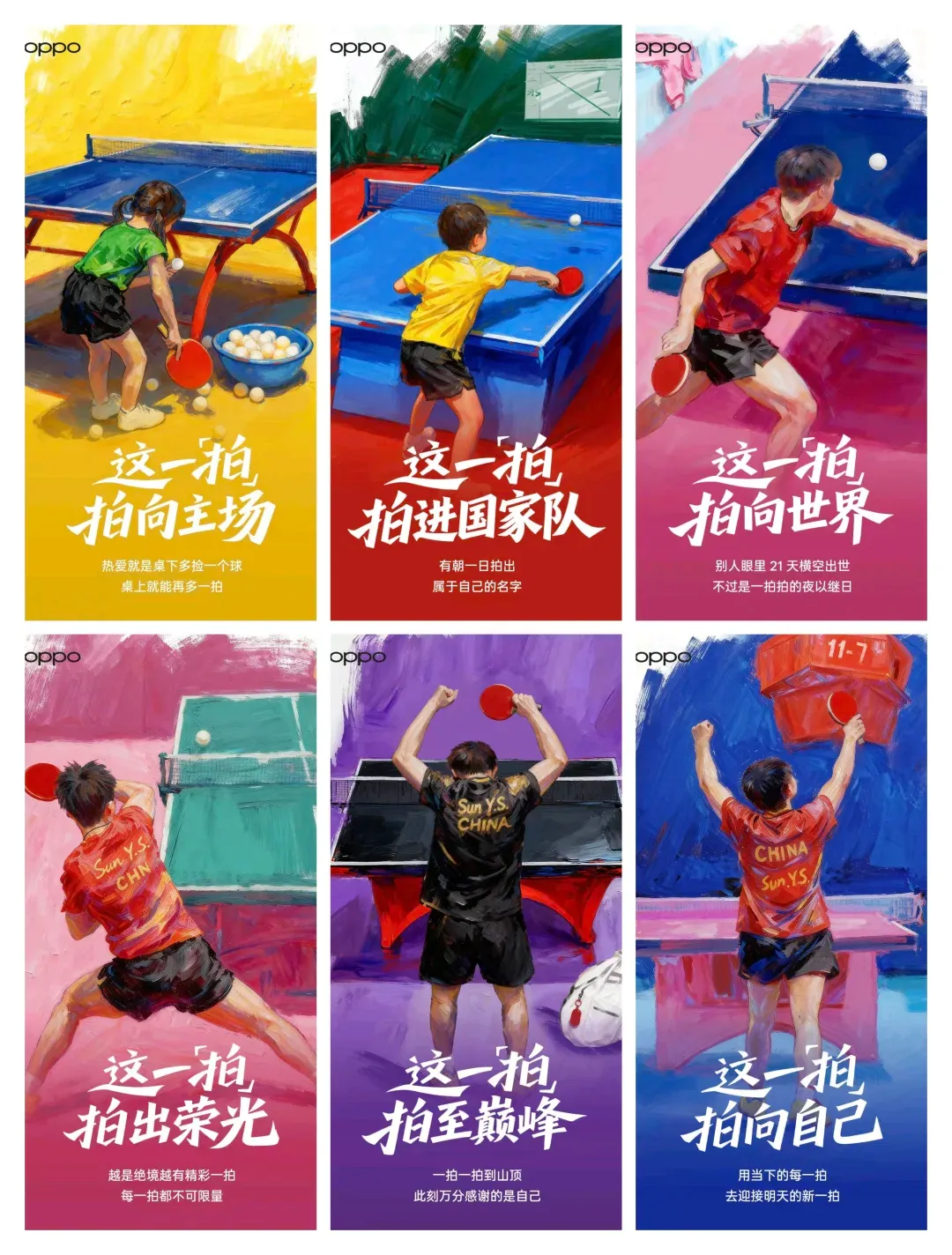 在这次合作中,OPPO 把“拍”做成了双关:不仅是孙颖莎作为乒乓球运动员的每一“拍”球,也暗合 OPPO 手机影像的每一次“拍”摄。《新的一拍》系列海报用「六拍」串联起孙颖莎的成长轨迹,每一拍都对应着她真实的人生节点。