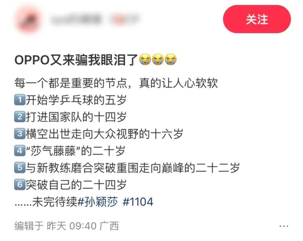 这正是 OPPO 的巧思——当影像功能难以拉开差距,就让“拍”从技术行为变成情感共鸣。从产品功能出发,用孙颖莎的故事,让品牌成为记录热爱、见证成长的角色,也让用户相信,生活中的每一次“拍”,都值得被记录。